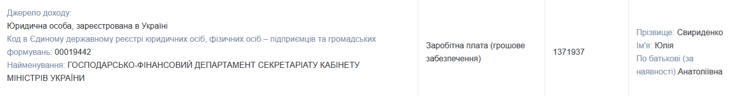 Згідно з декларацією, 2025 року вона отримала 1,37 мільйона гривень заробітної плати в Кабінеті міністрів і 3,24 мільйона гривень гонорарів від Київської школи економіки (KSE).