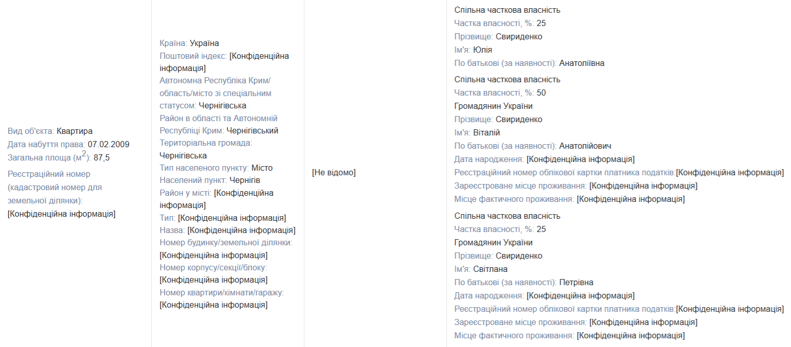 Свириденко володіє квартирою в Києві площею 33,5 квадратного метра та квартирою в Чернігові площею 74,3 квадратного метра. На неї також оформлена частка в розмірі 25% на квартиру в Чернігові, де вона є співвласницею разом із родичами.