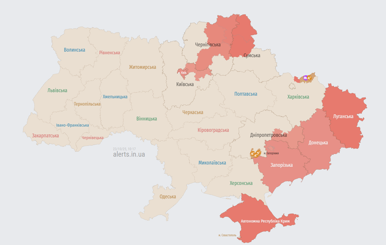 У ніч на 23 жовтня російська армія атакувала Україну ударними безпілотниками різних типів. Зафіксовано влучання 25 ударних дронів на 11 локаціях.