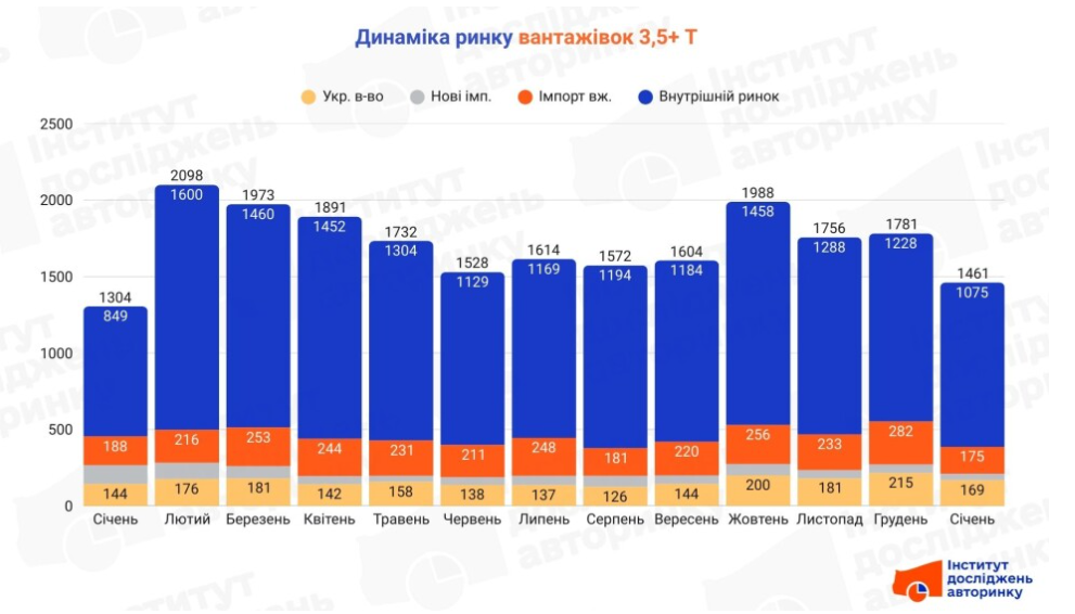 Сегмент імпорту вживаної техніки склав 175 одиниць, продемонструвавши суттєве падіння відносно грудня (-37,9%) та невелике просідання відносно минулого року (-6,9%). Водночас продажі нових вантажівок склали 211 одиниць, де значну частку — 169 машин — забезпечили українські виробники, тоді як чистий імпорт нових авто склав лише 42 одиниці. Примітно, що імпорт нової техніки впав майже на 66% відносно минулого року, тоді як вітчизняне виробництво зросло на 17,4%, наголошують аналітики.