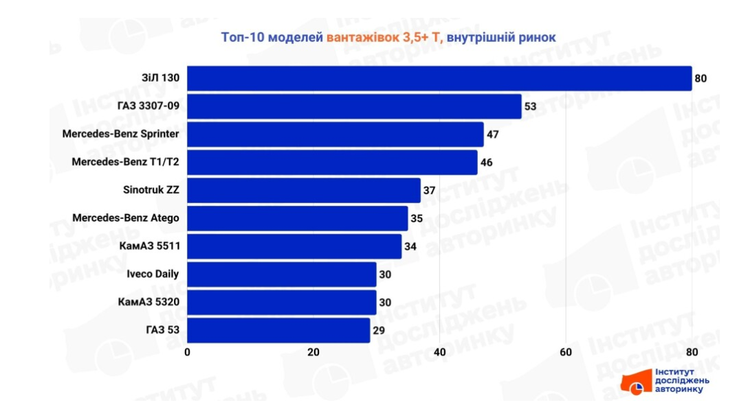 Згідно з дослідженням, на вторинному ринку лідером за кількістю угод залишається ветеран доріг ЗіЛ 130, за ним ідуть моделі ГАЗ 3307-09. Своєю чергою, європейський сегмент представлений сімействами Mercedes-Benz Sprinter (у важких версіях), T1/T2 та Atego, а також Iveco Daily. Китайський автопром на внутрішньому ринку закріпився моделлю Sinotruk ZZ (важкі самоскиди), а сегмент важкої радянської спадщини закривають КамАЗ 5511, 5320 та ГАЗ 53.