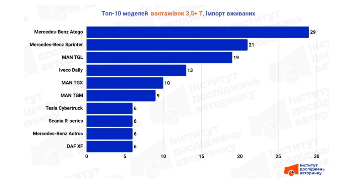 У рейтингу імпортних вантажівок з пробігом перше місце за Mercedes-Benz Atego, за ним іде важка версія Sprinter. Також представлений бренд MAN моделями TGL, TGX та TGM. Крім того, у десятку потрапили Iveco Daily, Scania R-series, Mercedes-Benz Actros та DAF XF.