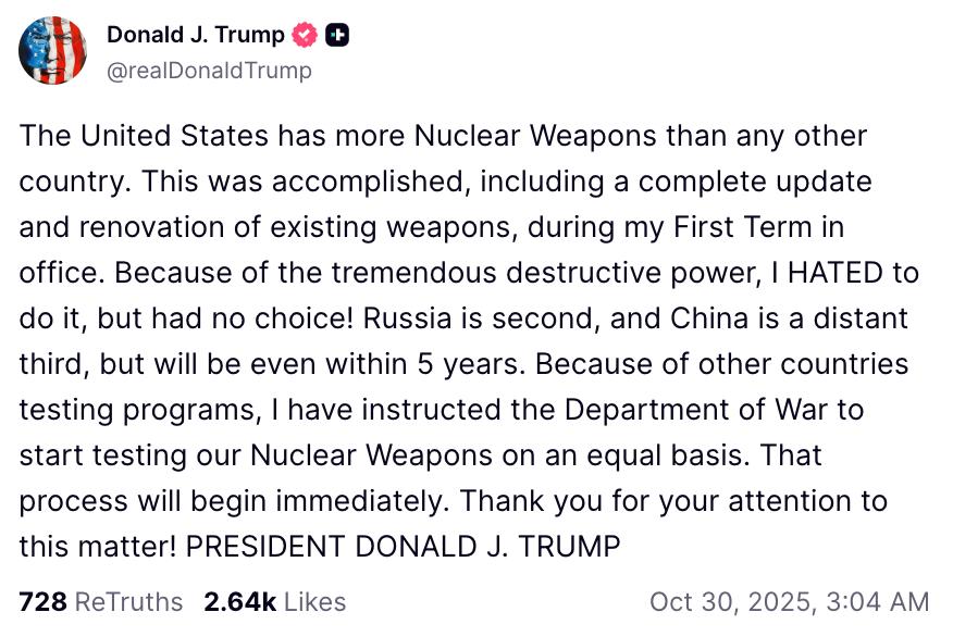 "США мають більше ядерної зброї, ніж будь-яка інша країна. Це було досягнуто, включно з повним оновленням і модернізацією наявної зброї, під час мого першого терміну на посаді. Через величезну руйнівну силу я НЕНАВИДІВ це робити, але не мав вибору! Росія — на другому місці, а Китай далеко позаду, але наздожене протягом п'яти років. Через те, що інші країни проводять випробування, я наказав Міністерству війни розпочати тестування нашої ядерної зброї на рівних умовах. Цей процес почнеться негайно", — написав він.