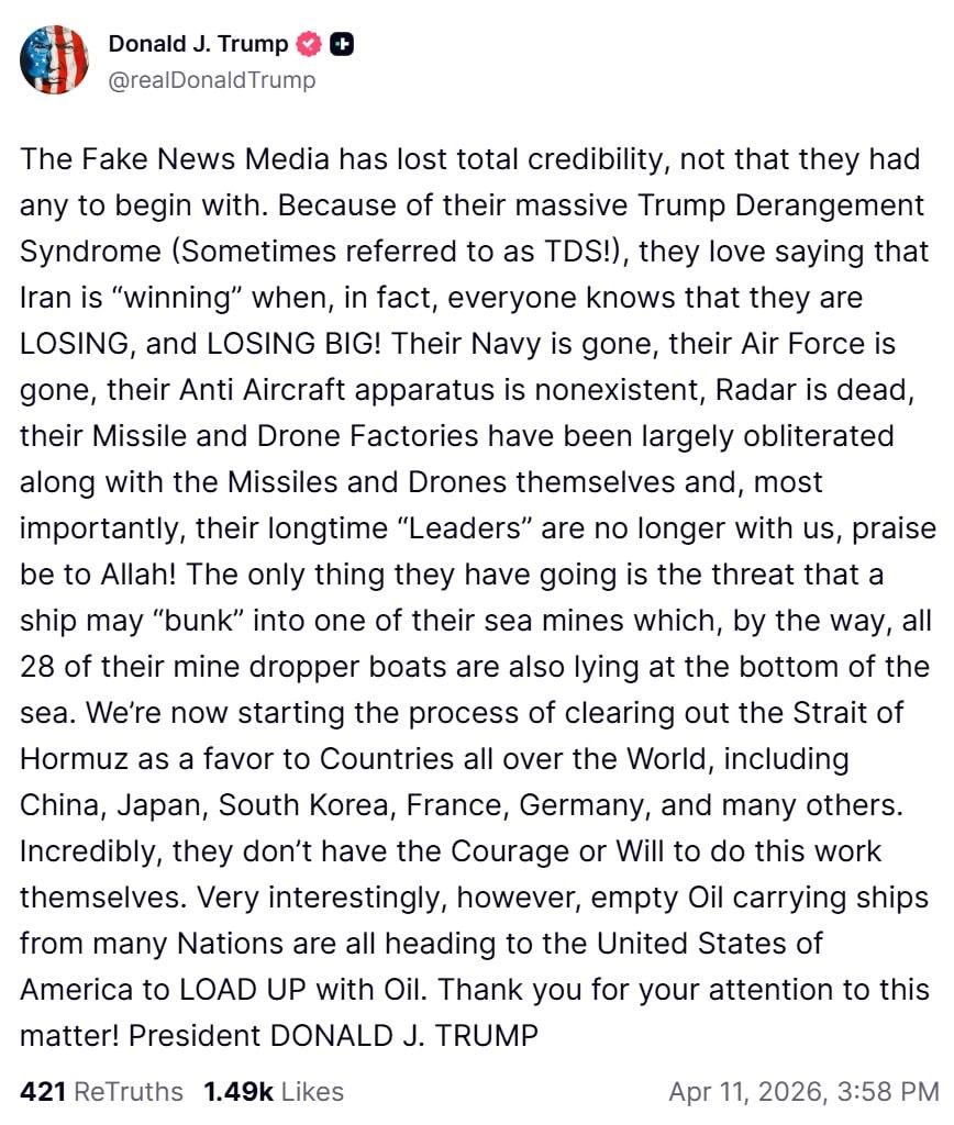 У дописі Трамп зазначив, що "фейкові ЗМІ повністю втратили довіру", оскільки через "синдром ненависті до Трампа" люблять говорити, що Іран "перемагає". Сам лідер США вважає, що це не так, а насправді Іран програє та "програє дуже потужно".