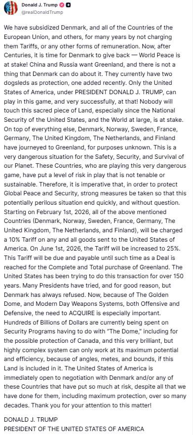 "Розпочинаючи з 1 лютого 2026 року, з усіх вищезазначених країн (Данія, Норвегія, Швеція, Франція, Німеччина, Велика Британія, Нідерланди та Фінляндія) стягуватиметься 10% мито на всі товари, які надсилатимуться до США. З 1 червня 2026 року мито збільшимо до 25%. Це мито підлягатиме сплаті доти, поки не вдасться досягнути угоди про повну й абсолютну купівлю Гренландії", — заявив американський лідер.