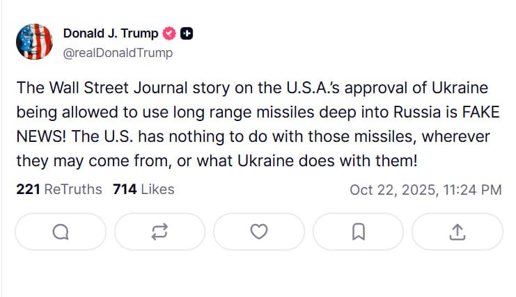 "Стаття у Wall Street Journal про те, що США схвалили дозвіл Україні використовувати ракети великої дальності глибоко в Росії, є фейковими новинами!", — написав він у Truth Social.