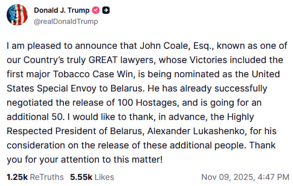 У неділю, 10 листопада, американський президент Дональд Трамп оголосив про висунення юриста Джона Коула на посаду спецпредставника Сполучених Штатів Америки в Білорусі.