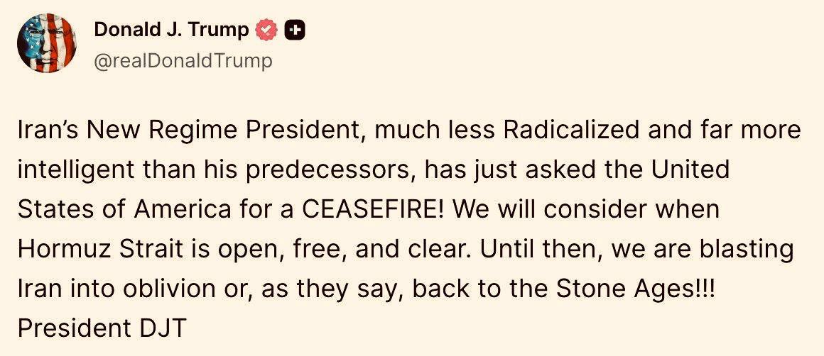"Іранський президент нового режиму, набагато менш радикалізований і набагато розумніший, ніж його попередники, щойно попросив США про припинення вогню!" — написав президент США.