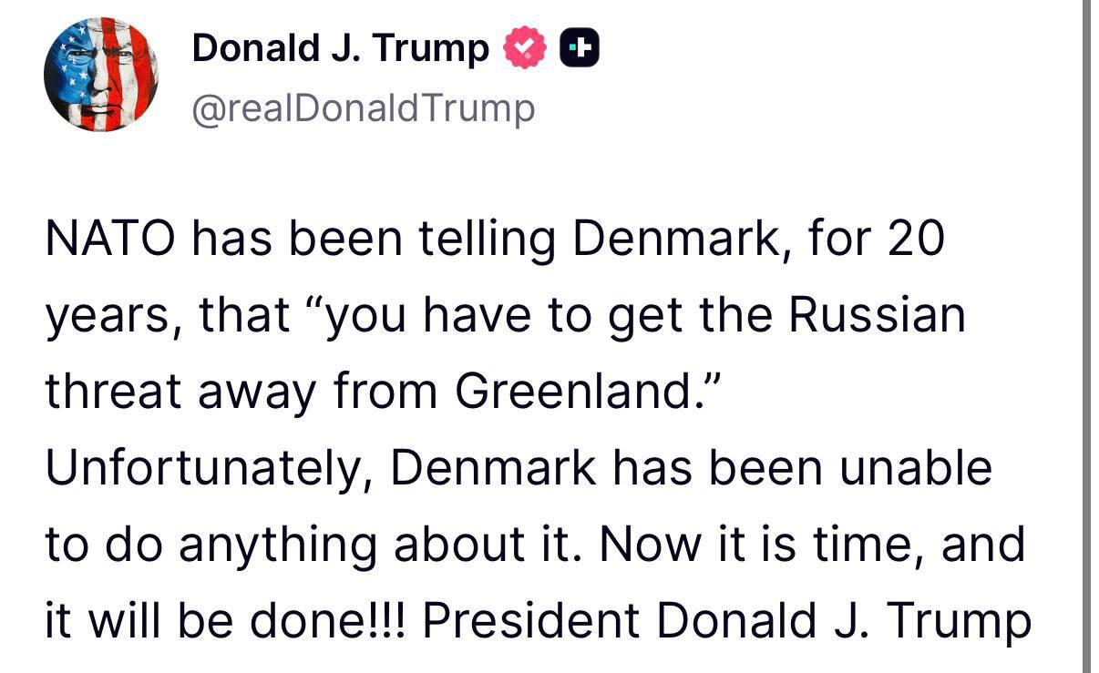Таку заяву американський лідер зробив у своєму дописі у Truth Social. Зокрема, президент США зазначив, що Північноатлантичний альянс вже близько 20 років попереджає Копенгаген про загрози з боку РФ.