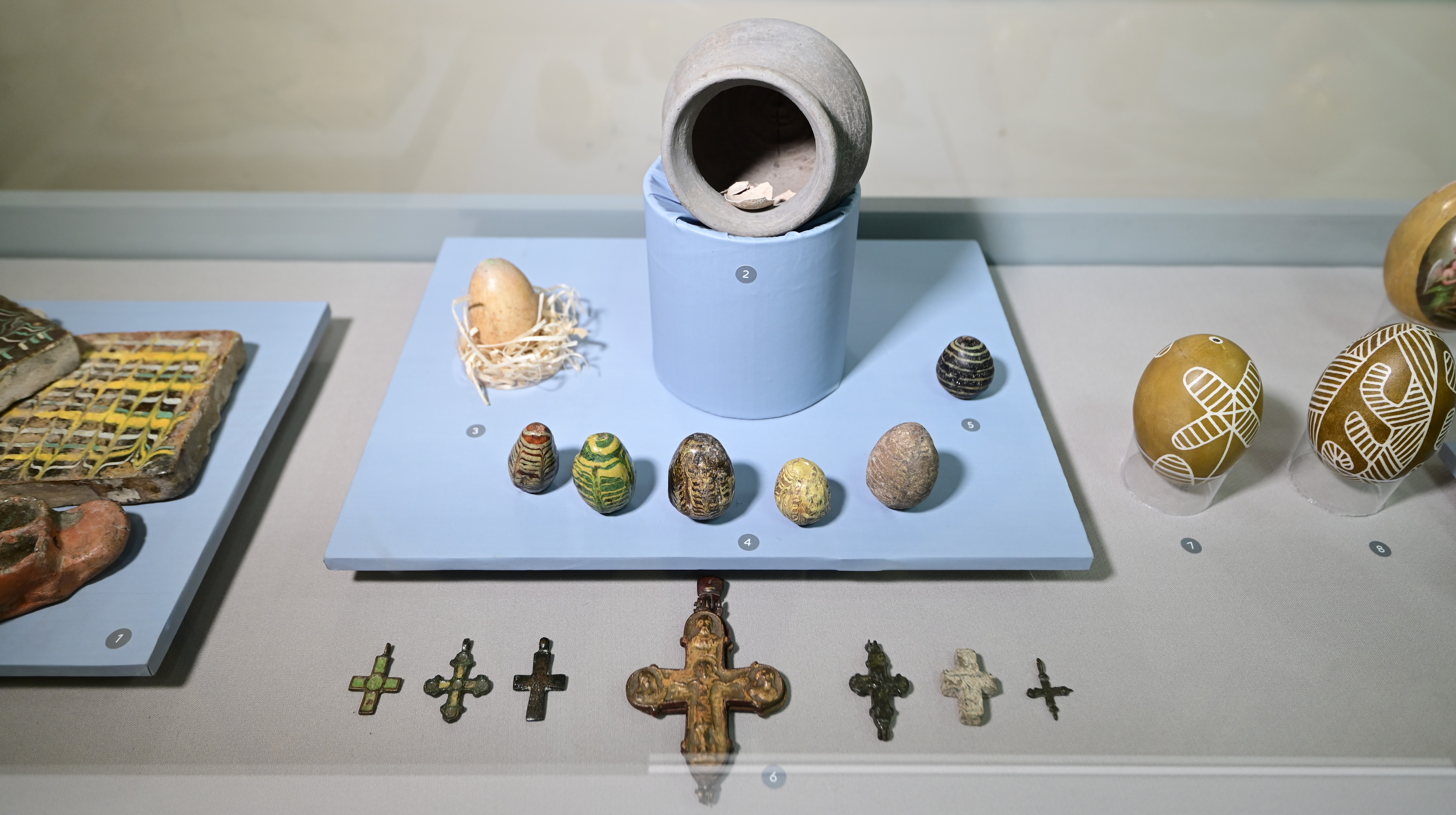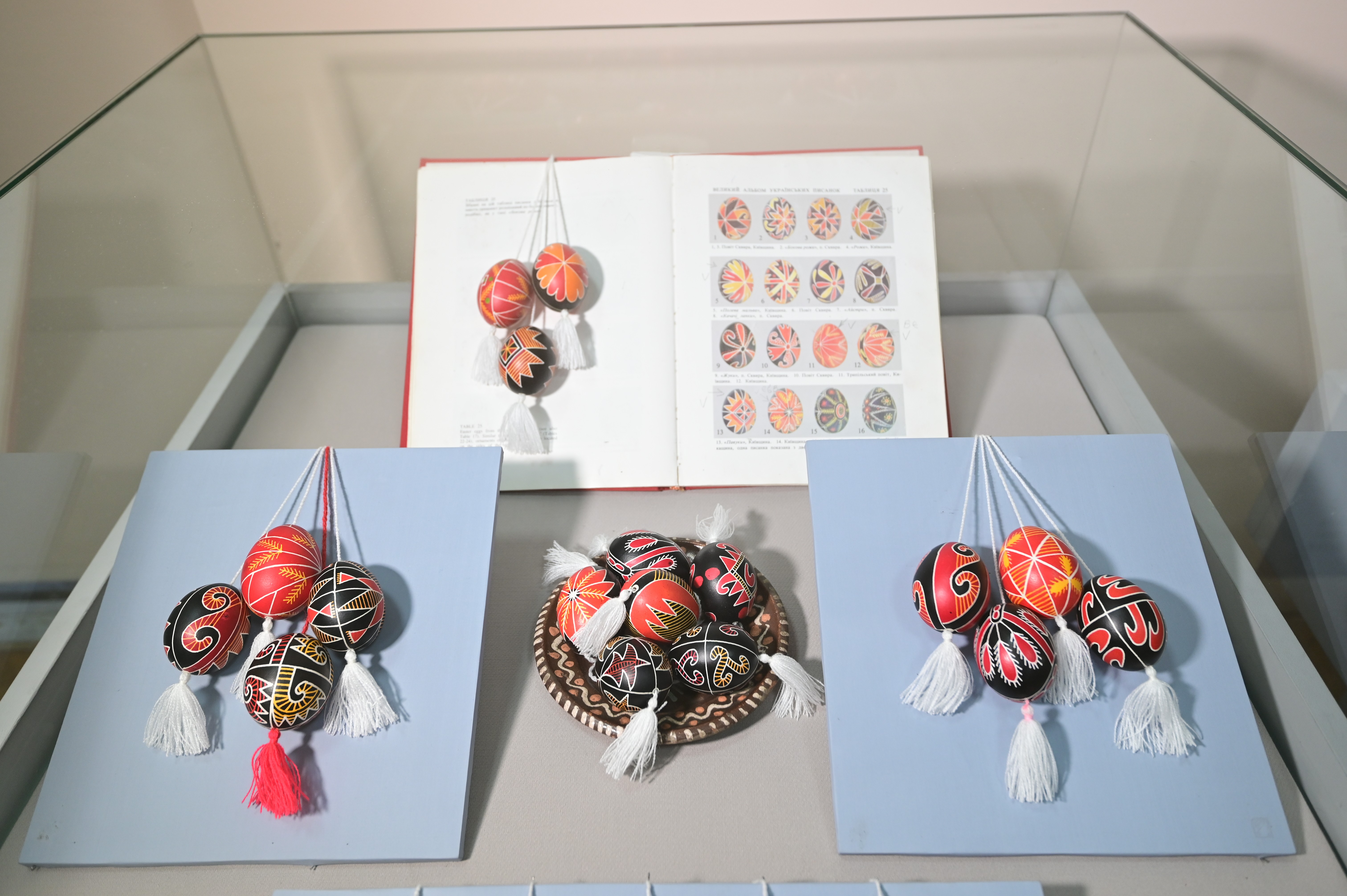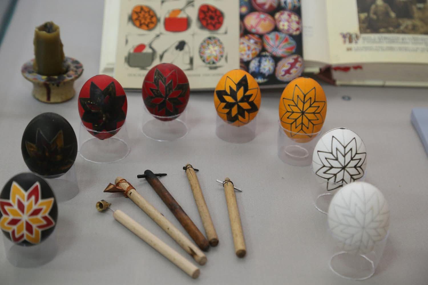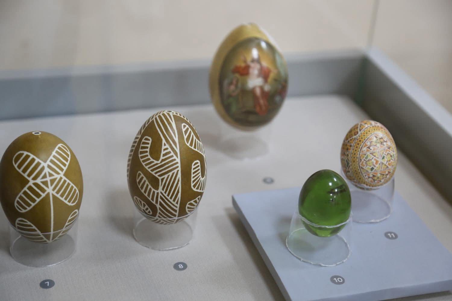 Серед експонатів виставки — реконструйовані писанки традиційної техніки воскового розпису, археологічні знахідки (писанки-брязкальця княжої доби, яйце з оленячого рогу) та фаянсові писанки Києво-Межигірської фаянсової фабрики. Вони показують не лише естетику, а й глибину традиції, яка формувалася на українських землях століттями.
