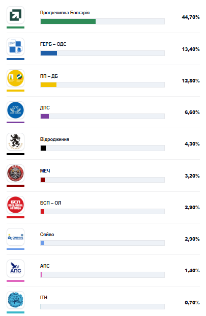 Станом на 11:00 20 квітня 2026 року офіційні дані свідчать про впевнене домінування партії "Прогресивна Болгарія". Політична сила отримала 44,7% голосів, що відповідає підтримці понад 1,39 мільйона громадян. Це забезпечує їй статус головної сили у новому скликані законодавчого органу.