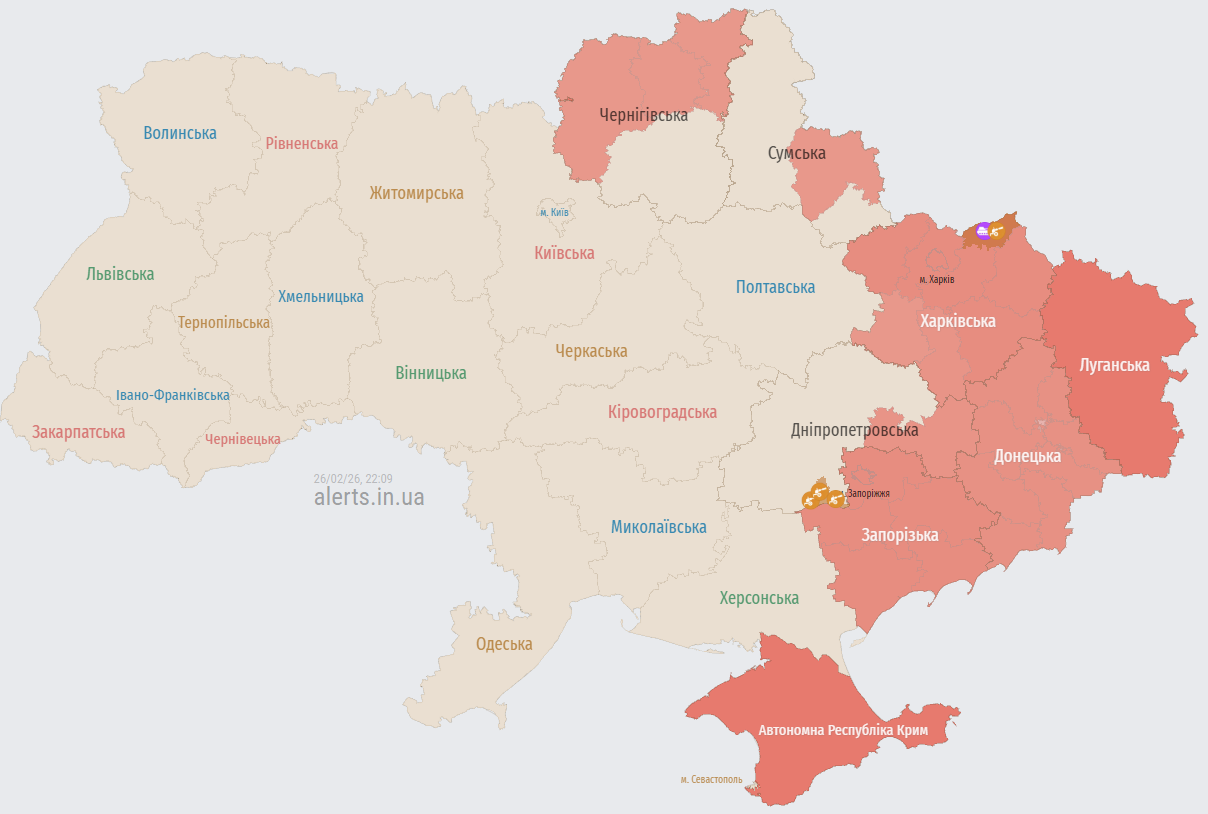 У четвер ввечері, 26 лютого, російські окупаційні війська продовжують атакувати територію України ударними безпілотниками. Декілька груп ворожих дронів маневрують над східними, північними та центральними регіонами країни, створюючи загрозу для мирних міст.