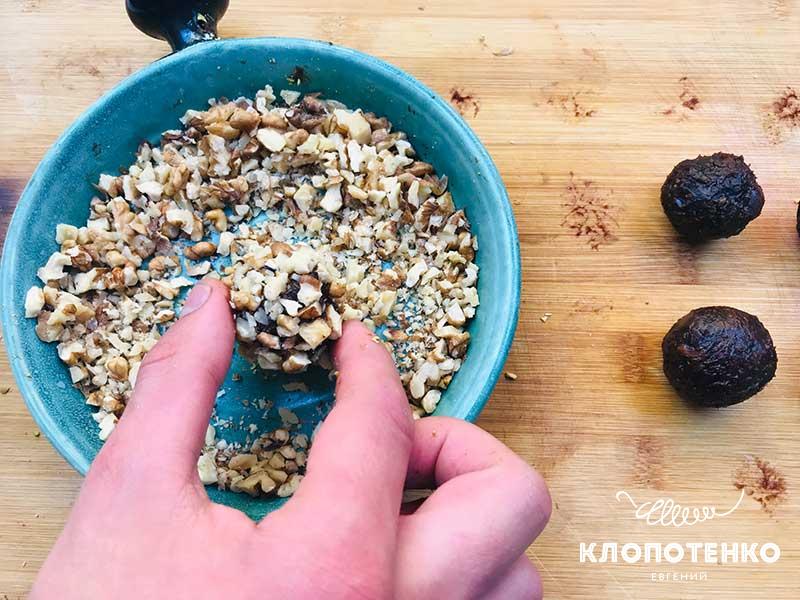 - Другу частину фінікових трюфелів обваляти в подрібнених крихтах фісташок.