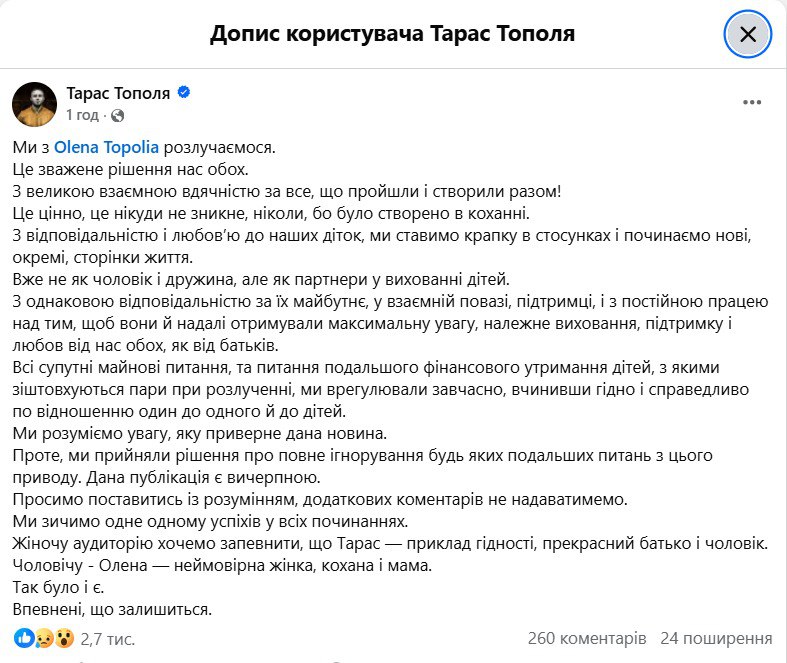 "Ми з Оленою Тополею розлучаємося. Це зважене рішення нас обох. З великою взаємною вдячністю за все, що пройшли й створили разом! Це цінно, це нікуди не зникне, ніколи, бо було створено в коханні. З відповідальністю і любов'ю до наших діток, ми ставимо крапку в стосунках і починаємо нові, окремі, сторінки життя. Вже не як чоловік і дружина, але як партнери у вихованні дітей", — зазначив він.