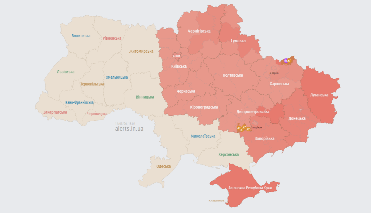 У суботу, 14 березня, вдень у більшості областей України оголошено повітряну тривогу. Причиною стала загроза удару балістичними ракетами з Брянської області Російської Федерації.