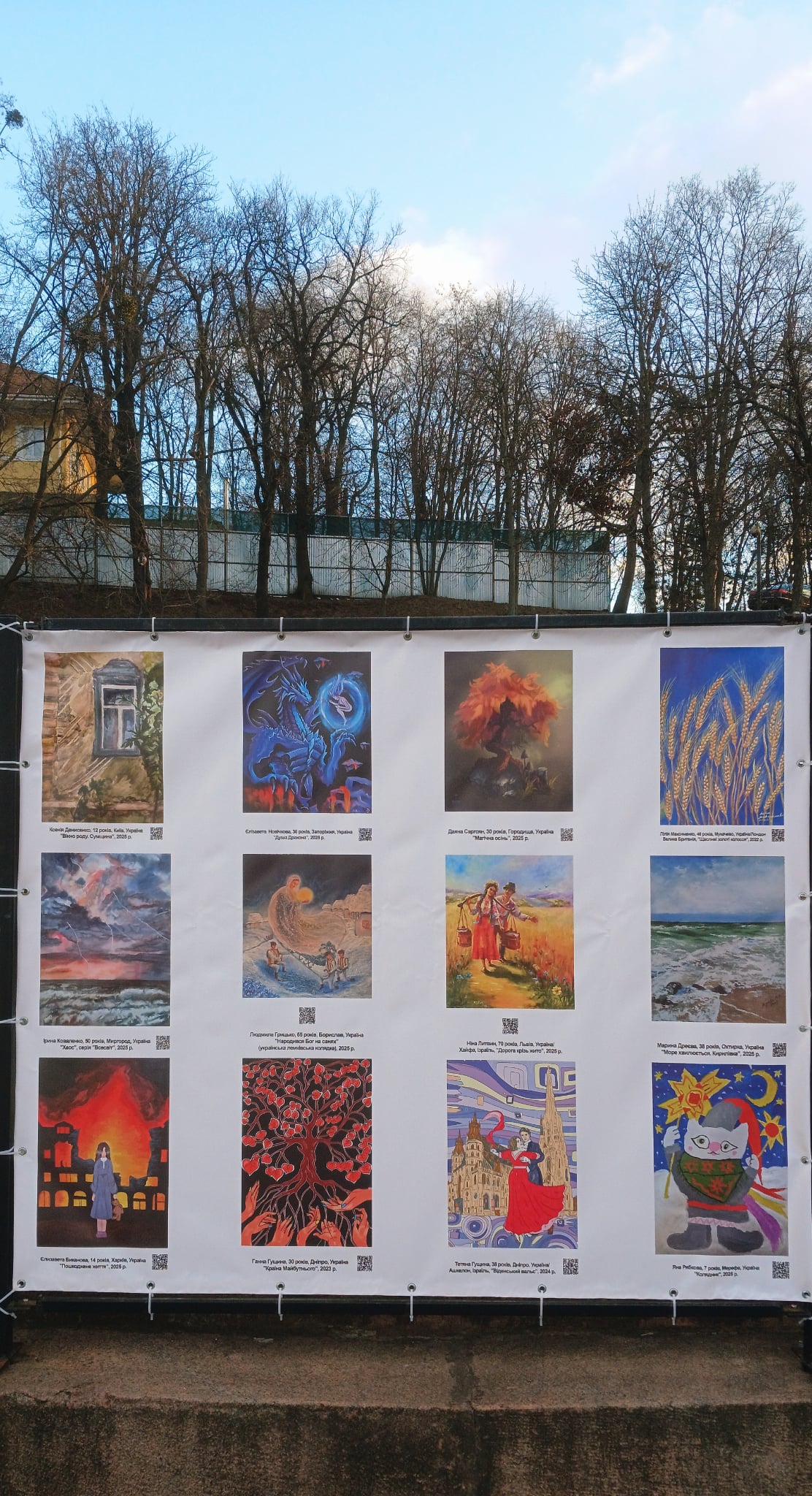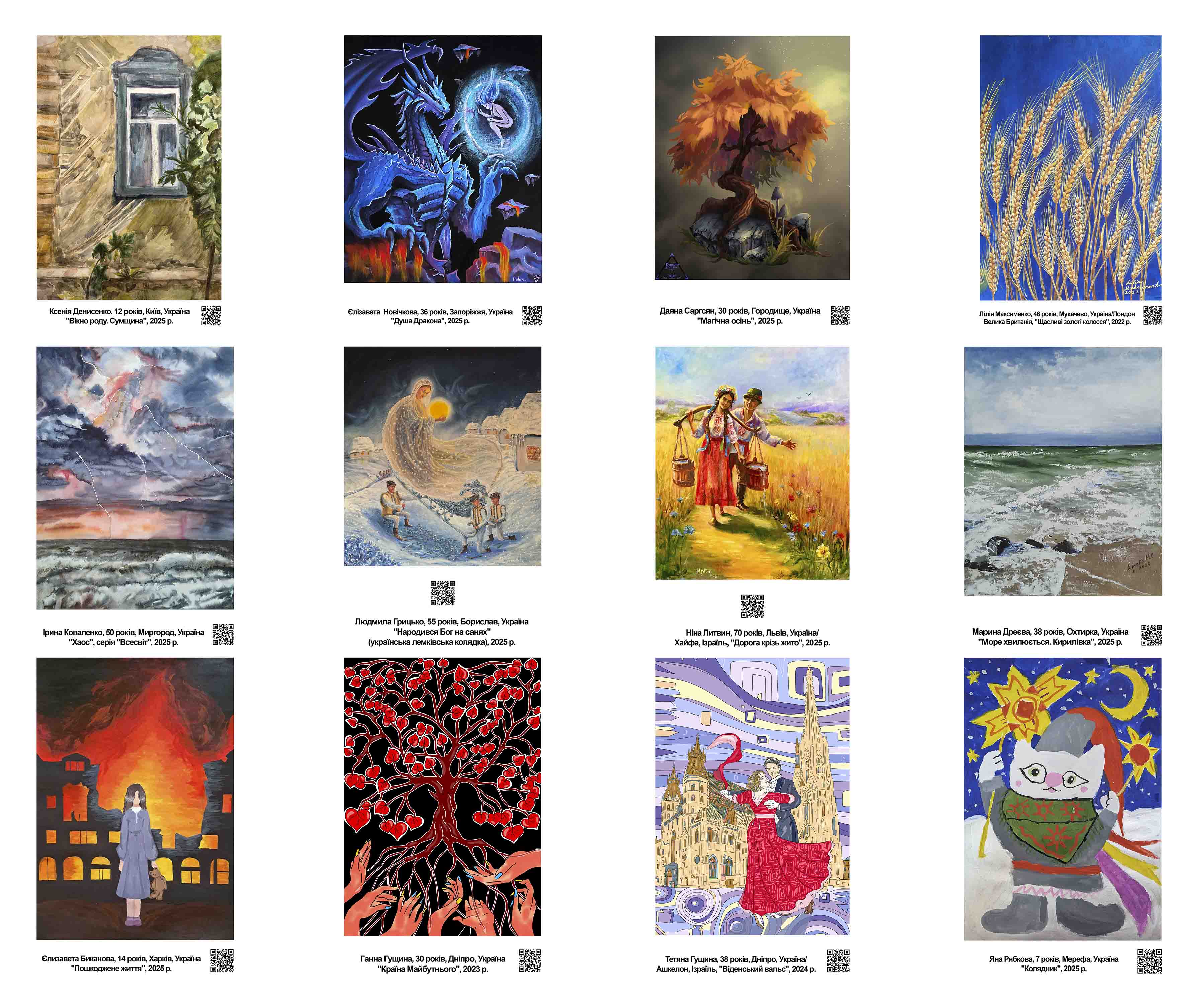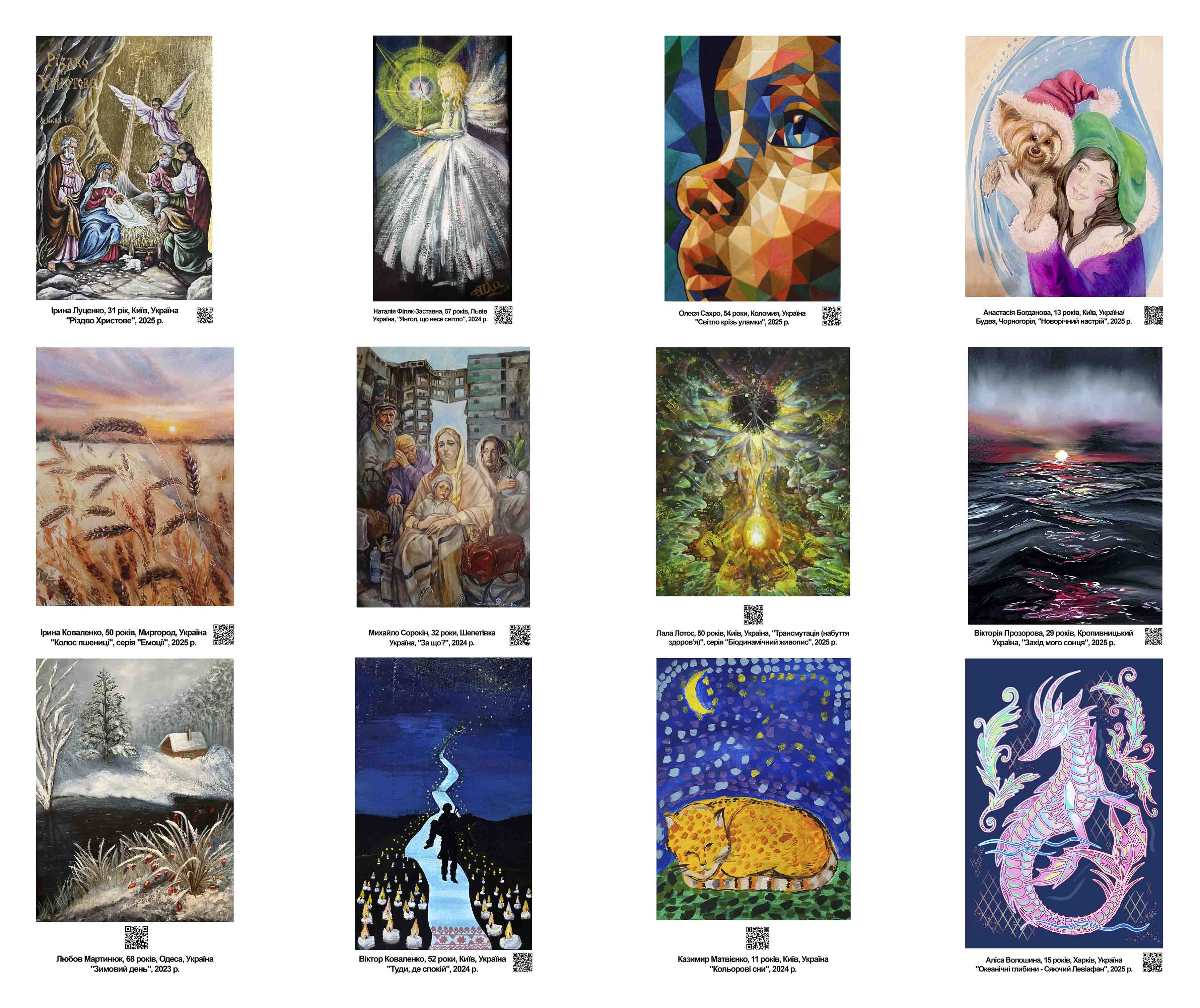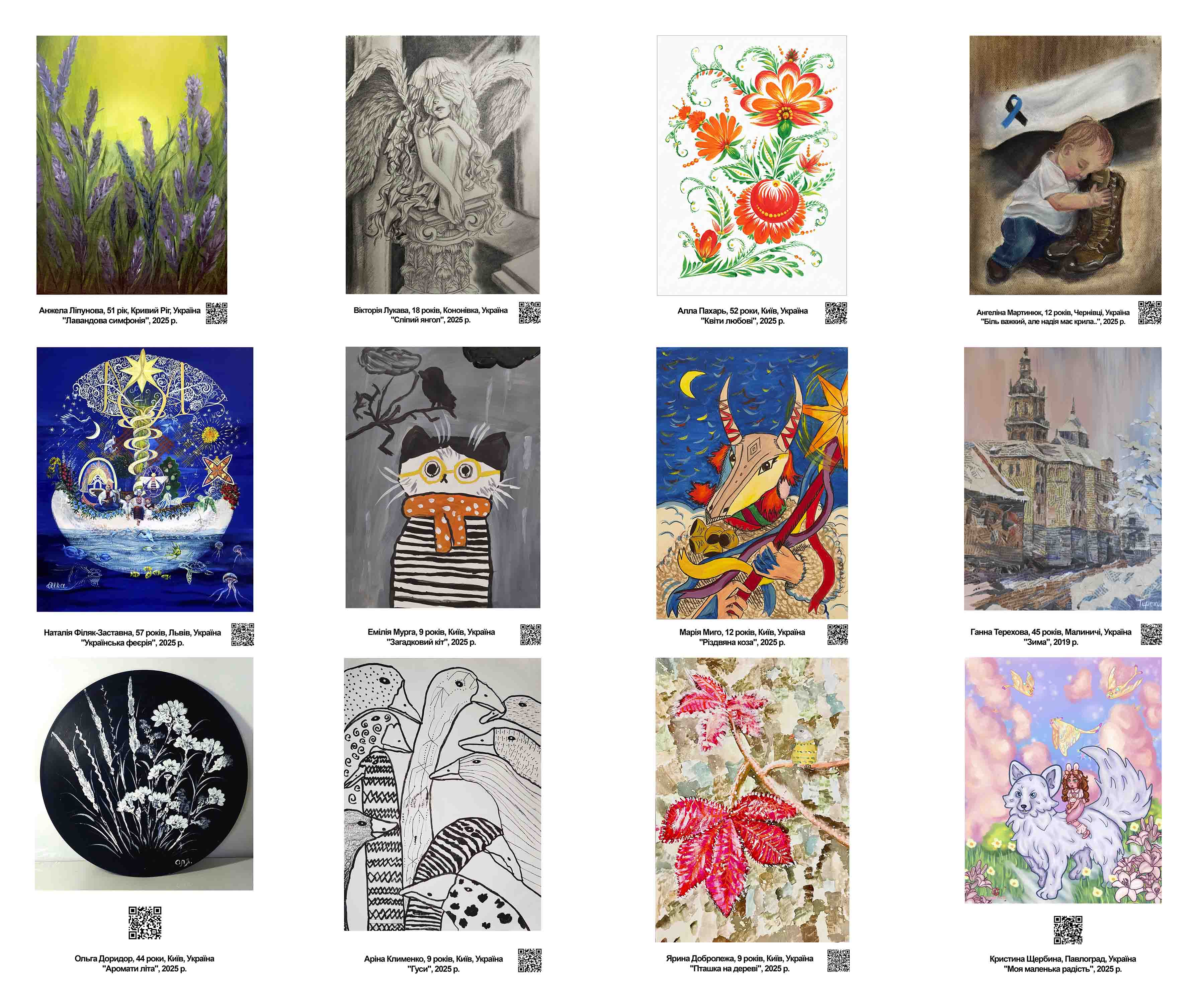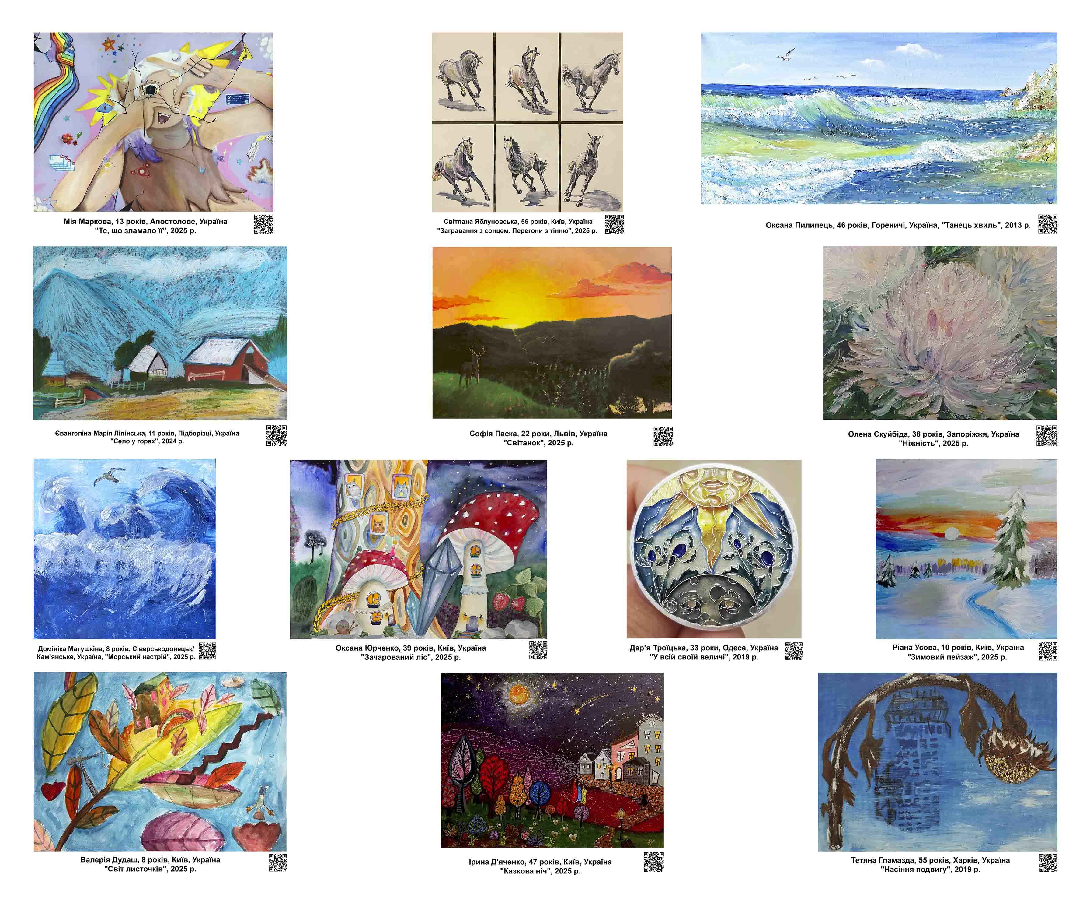 Серед робіт арт-марафону є роботи захисників України та дітей військовослужбовців, юних та дорослих громадян України, які майже чотири роки живуть під бомбардуваннями у своїх містах та селах, внутрішньо переміщених осіб та тих, хто був змушений покинути батьківщину через війну — кожен з них, по-своєму, щодня бореться за перемогу над агресором за мир в Україні.