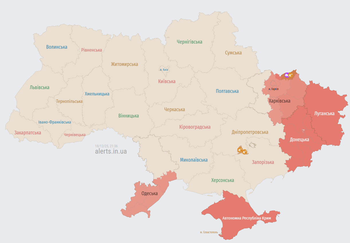 У четвер ввечері, 18 грудня, російська армія атакує Україну ударними безпілотниками. Загроза фіксується одразу в кількох областях.