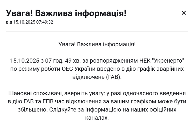 Вранці 15 жовтня в Україні запровадили екстрені відключення електроенергії. Обмеження діють у трьох областях.