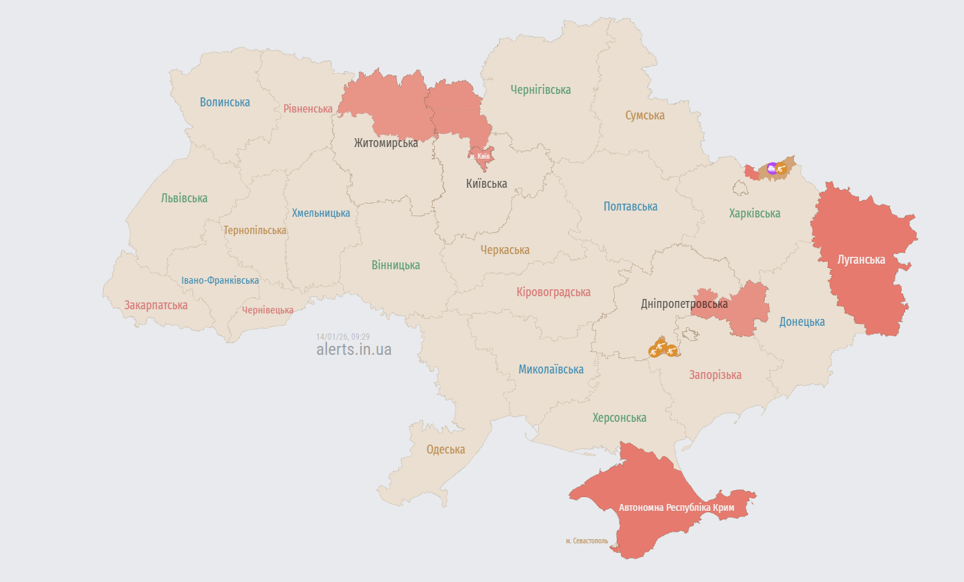 У середу, 14 січня, у Києві оголосили повітряну тривогу. Причиною є рух безпілотника у напрямку столиці.