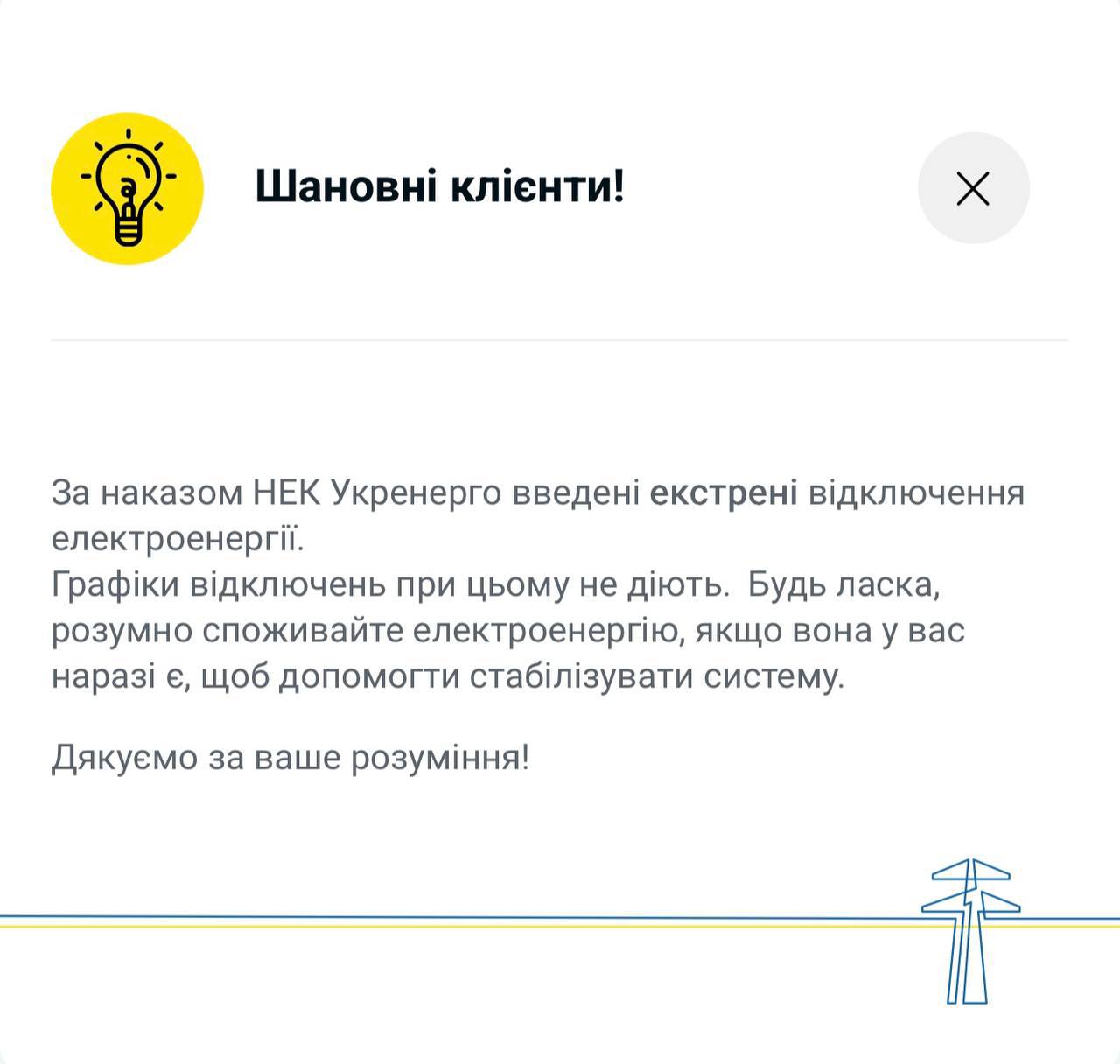 Вони нагадали, що під час екстрених відключень графіки погодинних вимкнень не діють.