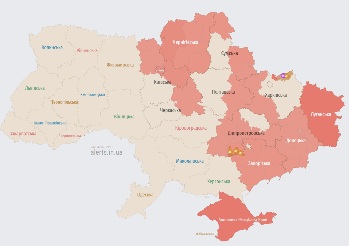 Зранку 24 квітня у Києві та низці регіонів оголошували тривогу через масований запуск загарбниками дронів-камікадзе, які рухалися групами на різних ділянках. Військові попереджали про зміну курсів БпЛА та закликали громадян перебувати в безпечних місцях до завершення небезпеки.