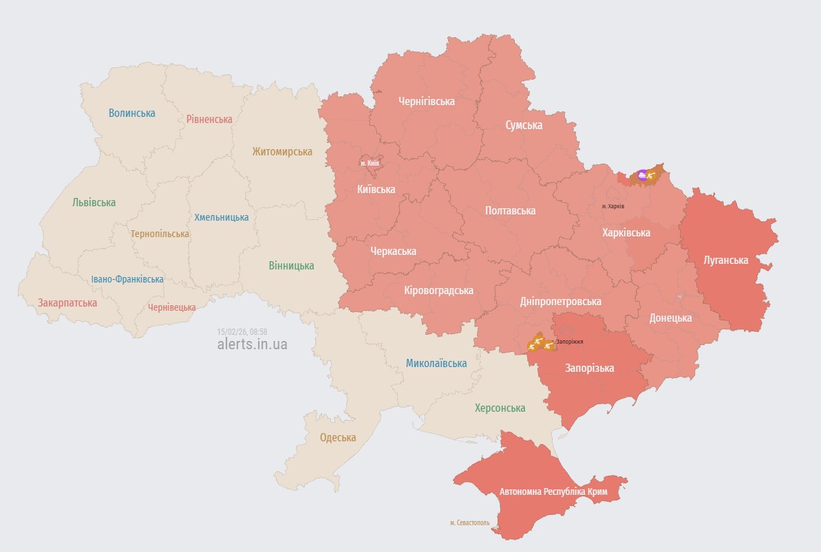 Вранці 15 лютого низку регіонів України охопила повітряна тривога. Існує ракетна небезпека.
