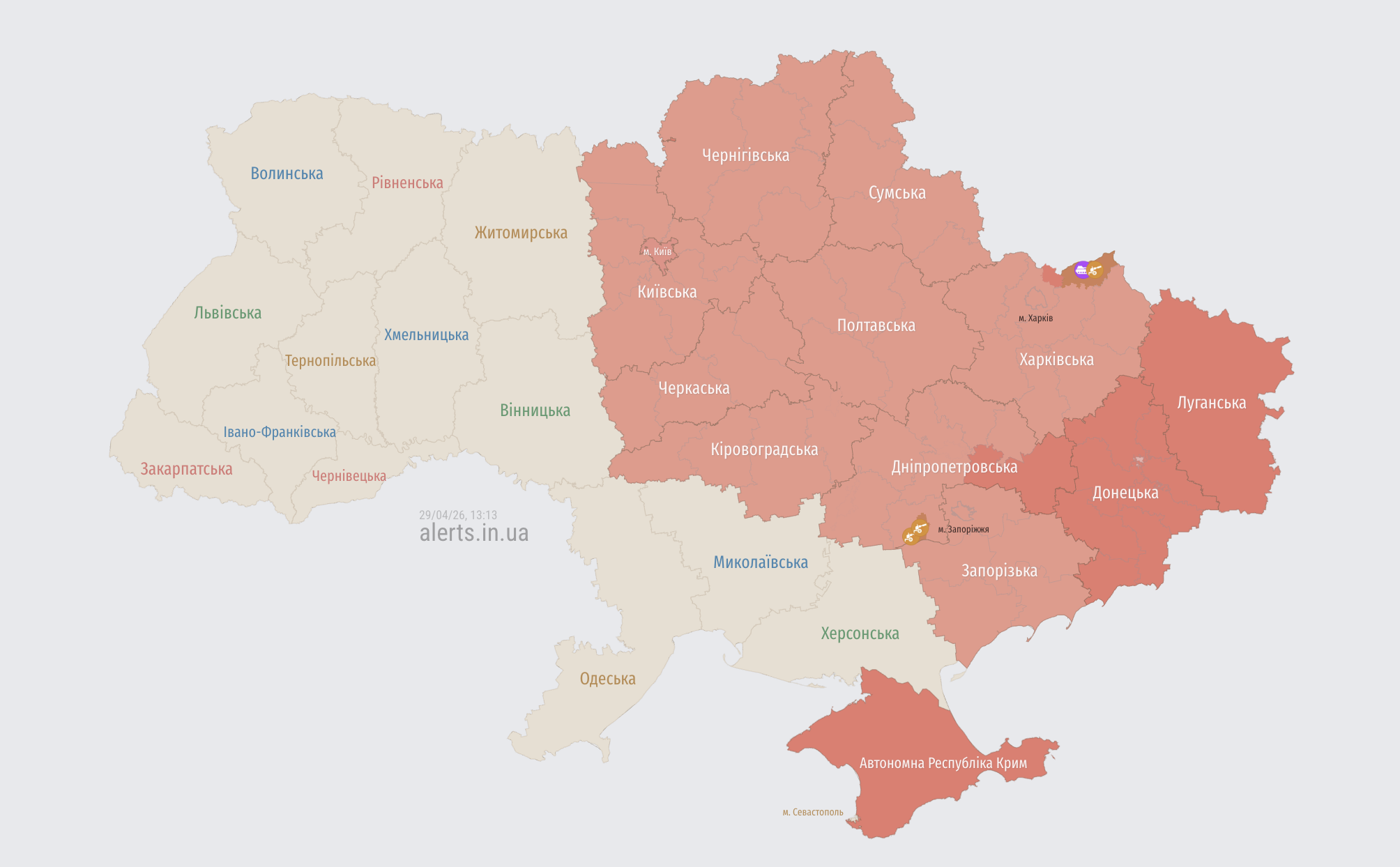 Вдень 29 квітня у Києві та низці регіонів оголосили повітряну тривогу. Військові попередили про загрозу балістики та закликали громадян перебувати в безпечних місцях до завершення небезпеки.