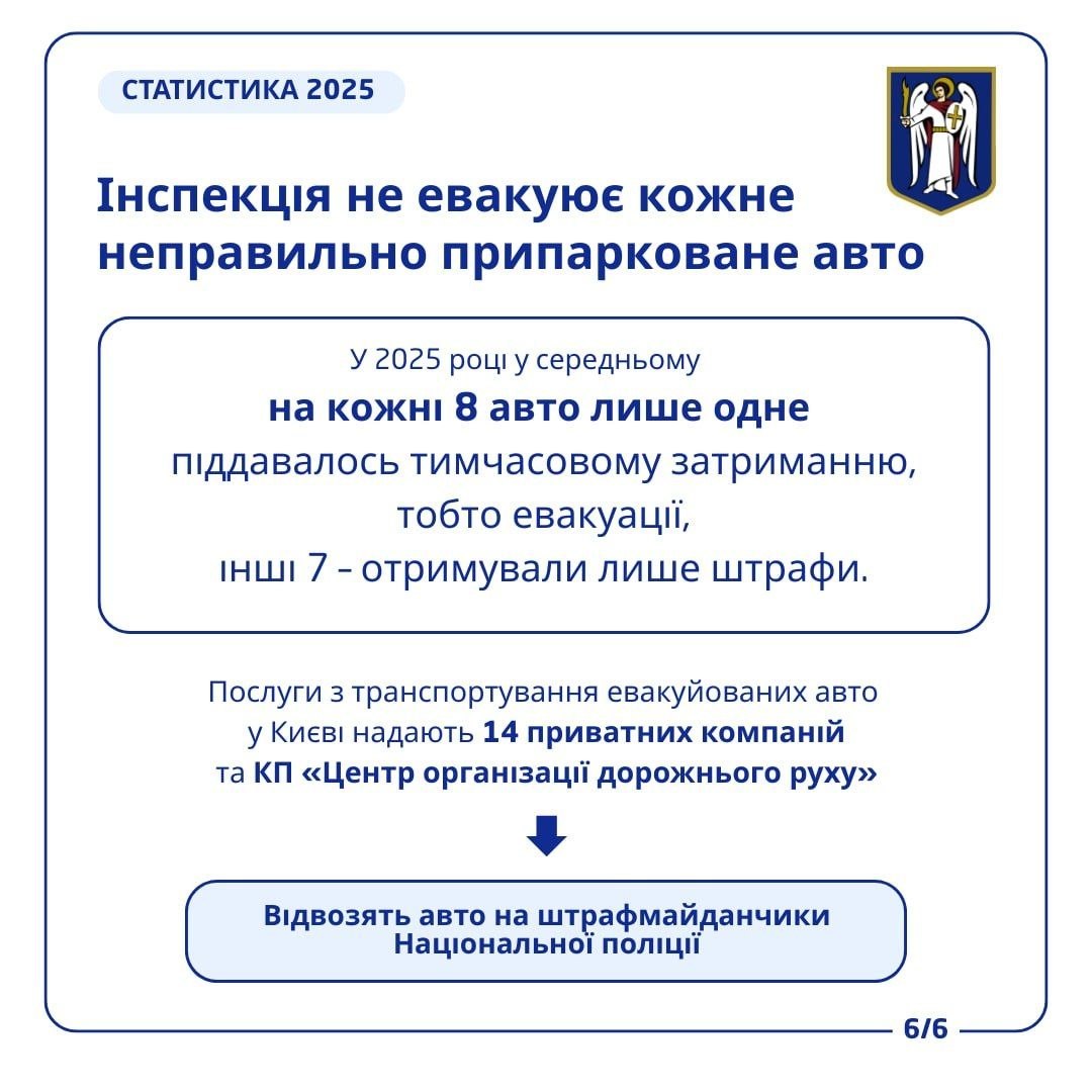 За даними інспекції з паркування, за 2025 рік у Києві було зафіксовано майже 400 тис. випадків порушення правил зупинки та стоянки. Проте евакуація залишається винятковим заходом: на штрафмайданчик відправляють лише кожну восьму автівку, що реально перешкоджає руху громадського транспорту, спецслужб або блокує виїзди.