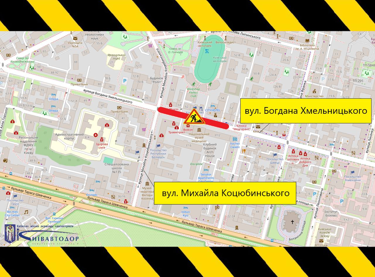 Також із 13 до 31 жовтня частково обмежуватимуть рух вулицею Богдана Хмельницького в Шевченківському районі столиці. Дорожники запланували ремонт тротуару на ділянці цієї вулиці від будинку № 52 до вулиці Михайла Коцюбинського.