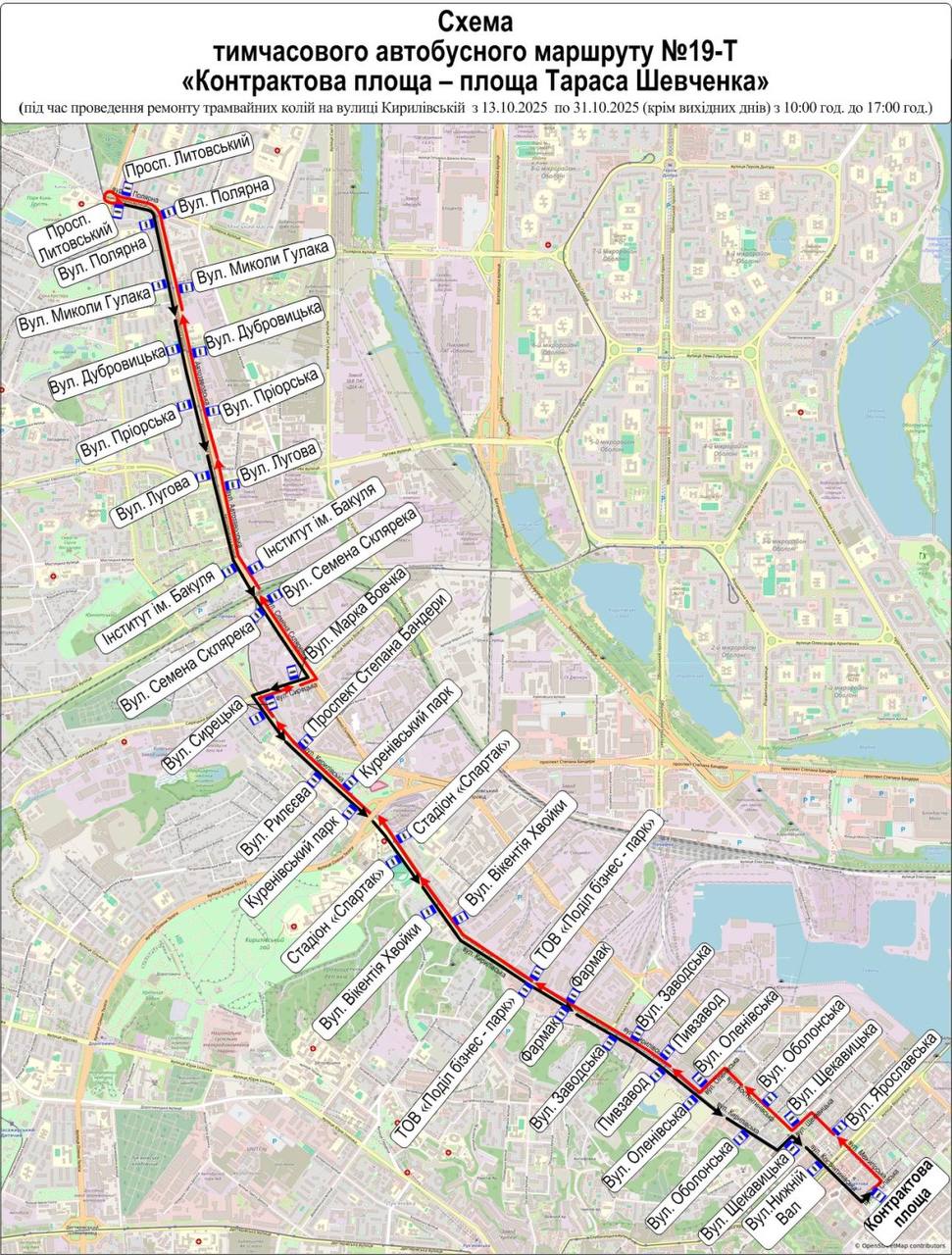 Зазначається, що для перевезення пасажирів від Контрактової площі до площі Тараса Шевченка буде організований тимчасовий автобусний маршрут № 19-Т, який курсуватиме за маршрутом: вулиця Спаська, вулиця Межигірська, вулиця Щекавицька, вулиця Костянтинівська, вулиця Оленівська, вулиця Кирилівська, вулиця Сирецька, вулиця Семена Скляренка, вулиця Автозаводська, вулиця Полярна до площі Тараса Шевченка.