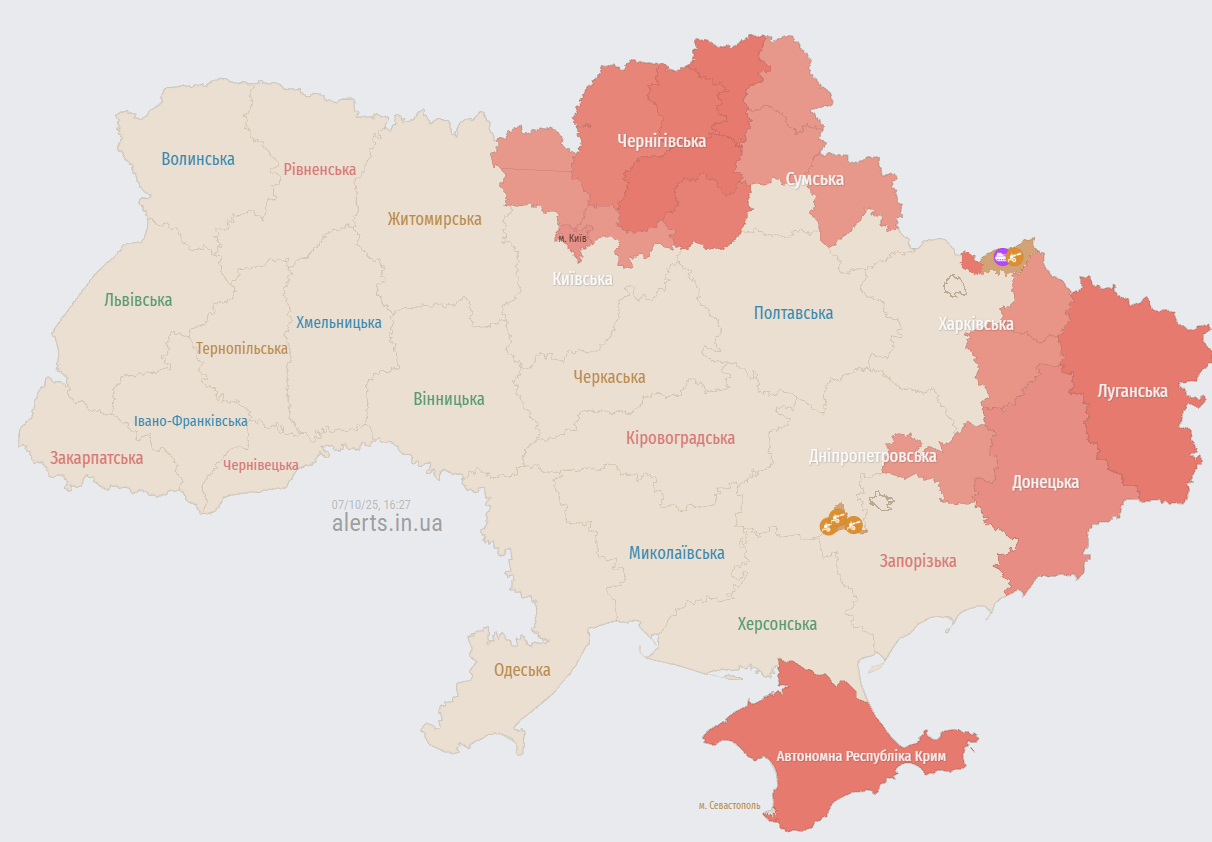Мапа повітряних тривог станом на 16:25 має такий вигляд: