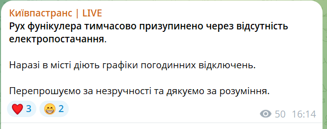 "Рух фунікулера тимчасово призупинено через відсутність електропостачання", — йдеться у повідомленні.