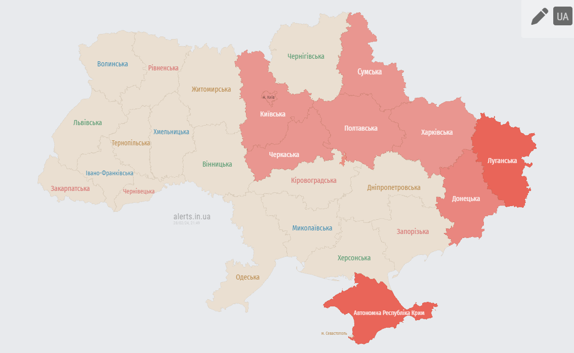 Ввечері 28 лютого у низці областей України пролунали сигнали повітряної тривоги. Небезпека пов'язана з пуском ракет.