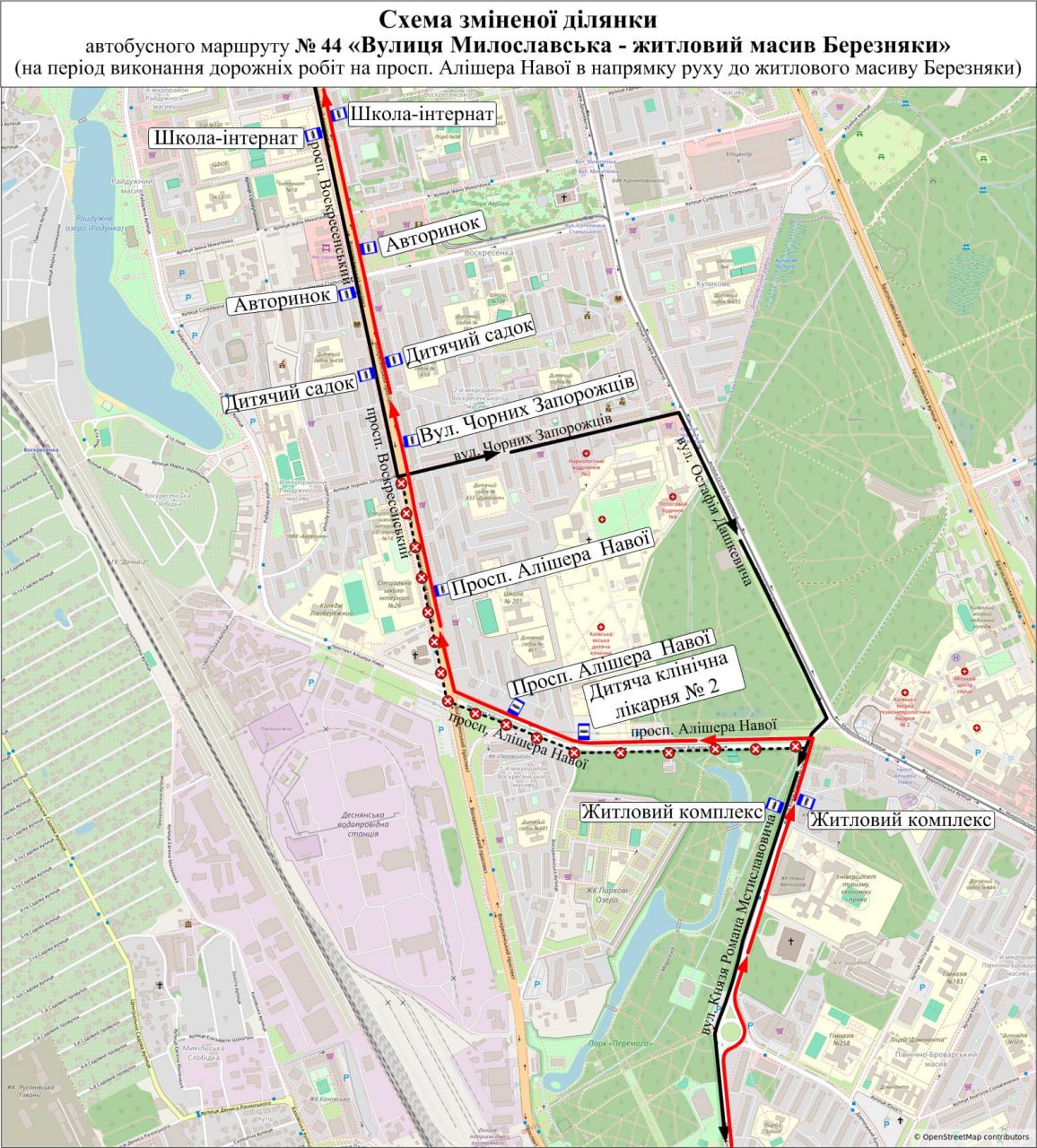 До того ж 12 та 13 жовтня внесуть зміни в маршрут автобуса № 44 через дорожні роботи на проспекті Алішера Навої. Із 8:00 до 20:00 рух автобусів у напрямку до житлового масиву Березняки організують: від вул. Милославської до просп. Воскресенського за власним маршрутом, далі вул. Чорних Запорожців — вул. Остафія Дашкевича — просп. Алішера Навої — вул. Князя Романа Мстиславовича — далі за власним маршрутом.