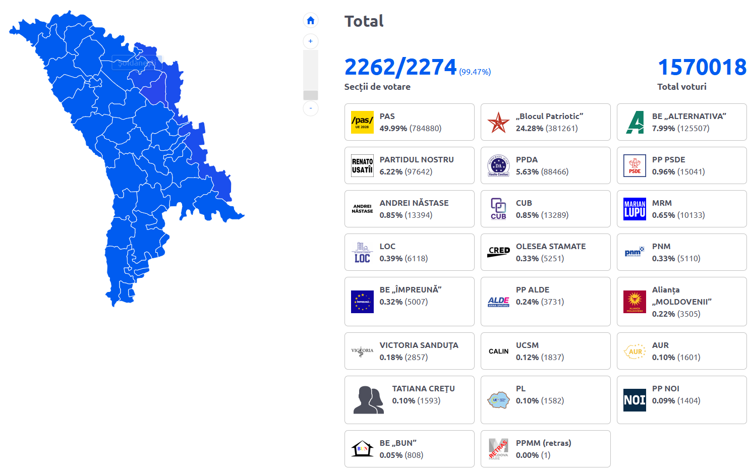 Станом на ранок понеділка, 29 вересня, у Молдові за підсумками обробки 99,47 відсотка протоколів керівна проєвропейська партія "Дія і солідарність" (PAS), заснована лідеркою Молдови Маєю Санду, набирає 49,99 процента голосів до парламенту. За її політичну силу наразі проголосувало 784 880 виборців.