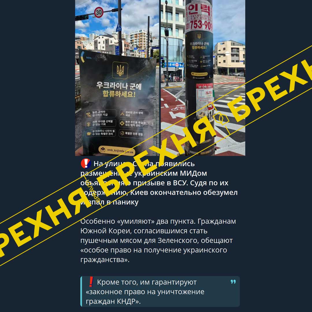 Російські пропагандисти оприлюднили чергову дезінформацію — цього разу стосовно того, що Міністерство закордонних справ нібито вербує корейців у Сеулі для служби в Збройних силах України.