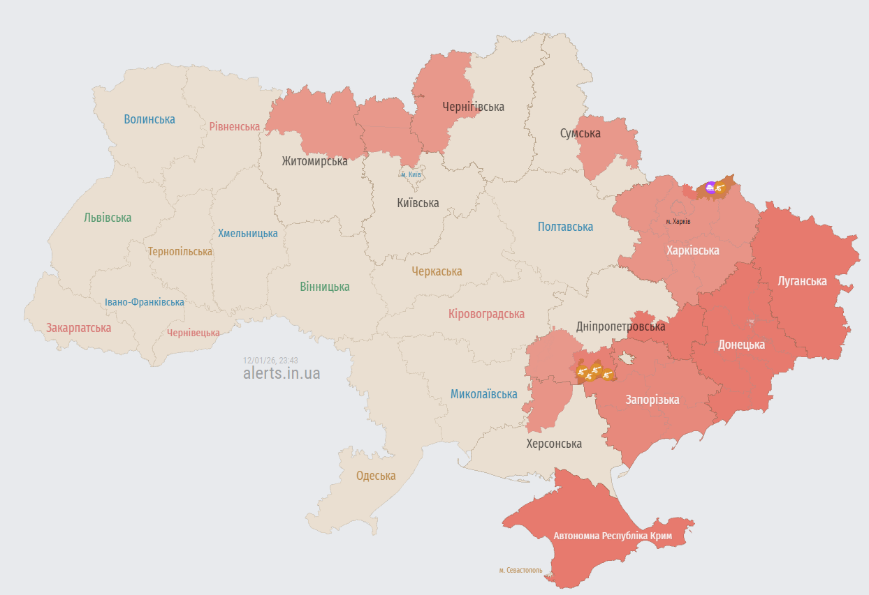 Увечері 12 січня російські окупанти здійснюють чергову атаку на територію України, застосовуючи безпілотники, керовані авіабомби та балістичне озброєння. Під ударом опинилися декілька регіонів.