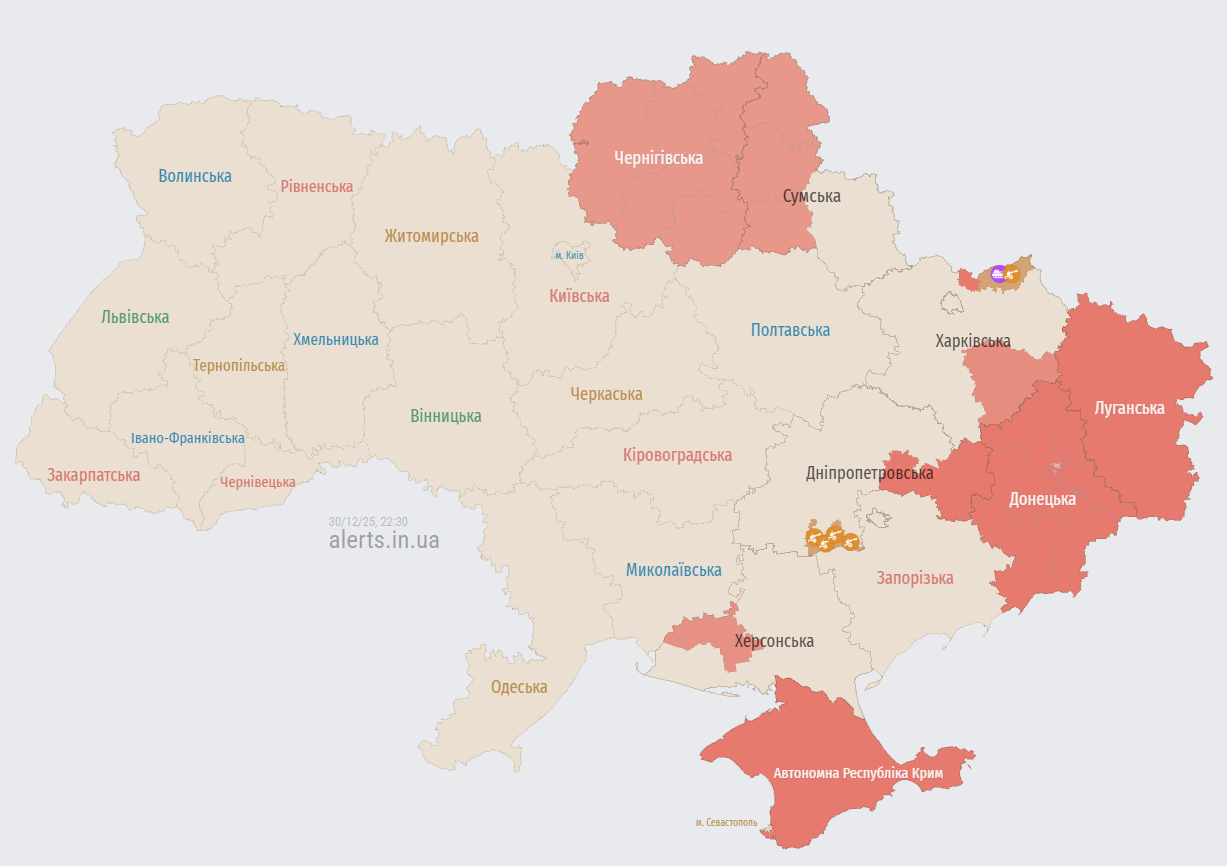 У вівторок, 30 грудня, російська армія атакує Україну ударними безпілотниками. Повітряну тривогу оголошено на Півночі нашої держави.
