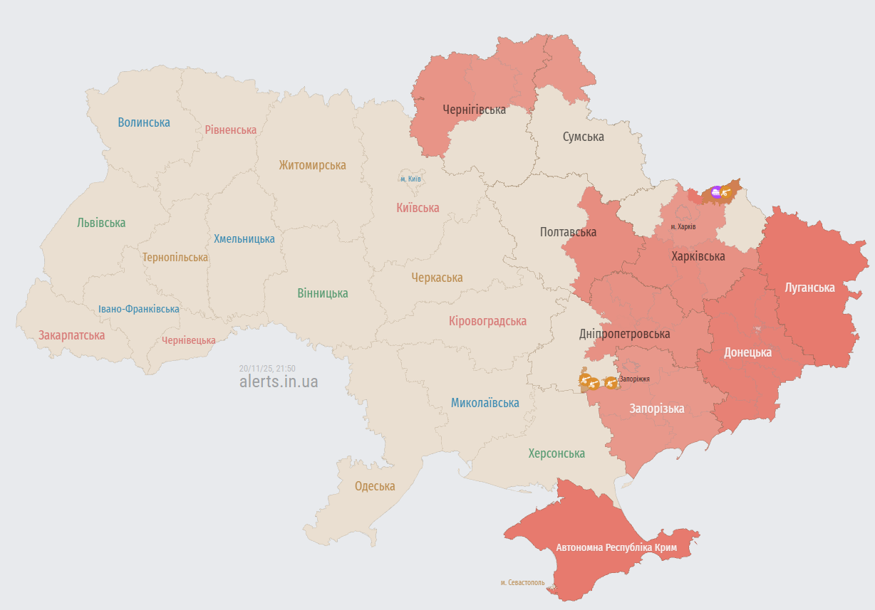 У четвер ввечері, 20 листопада, російська армія атакує Україну ударними безпілотниками. Повітряну тривогу оголошено у низці областей.
