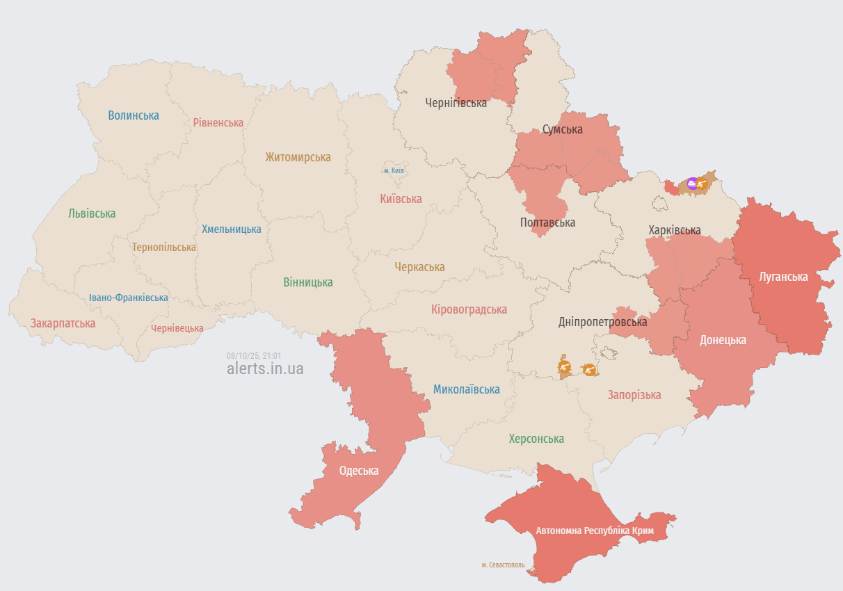 У середу ввечері, 8 жовтня, російська армія атакує Україну ударними безпілотниками. Повітряну тривогу оголошено у низці областей.
