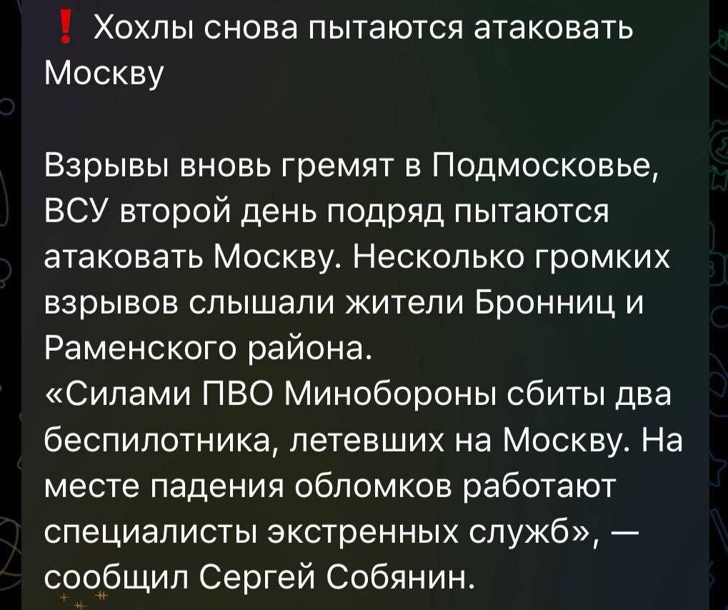 Мер Москви Сергій Собянін спробував заспокоїти мешканців столиці. Він написав, що російська протиповітряна оборона нібито збиває безпілотники, які летіли на Москву. Він додав, що на місці інциденту працюють екстрені служби.