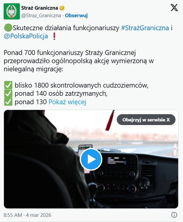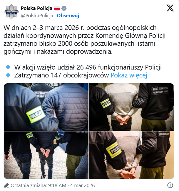 Під час масштабної загальнонаціональної операції польських правоохоронців було затримано 147 іноземців, серед яких абсолютну більшість — 91 особу — складають громадяни України. Щодо багатьох наших земляків уже розпочато процедури примусового повернення на батьківщину через порушення правил перебування або загрозу безпеці держави.