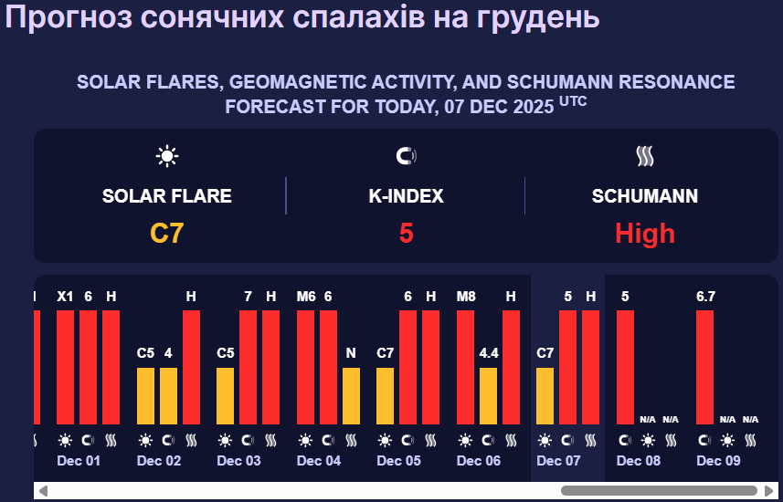 За даними порталу meteoagent.com, 8 грудня прогнозується сонячна активність із К-індексом "пять", що відповідає червоному рівню небезпеки. Такий показник класифікується як сильна магнітна буря, здатна впливати на здоров’я та самопочуття метеозалежних осіб.