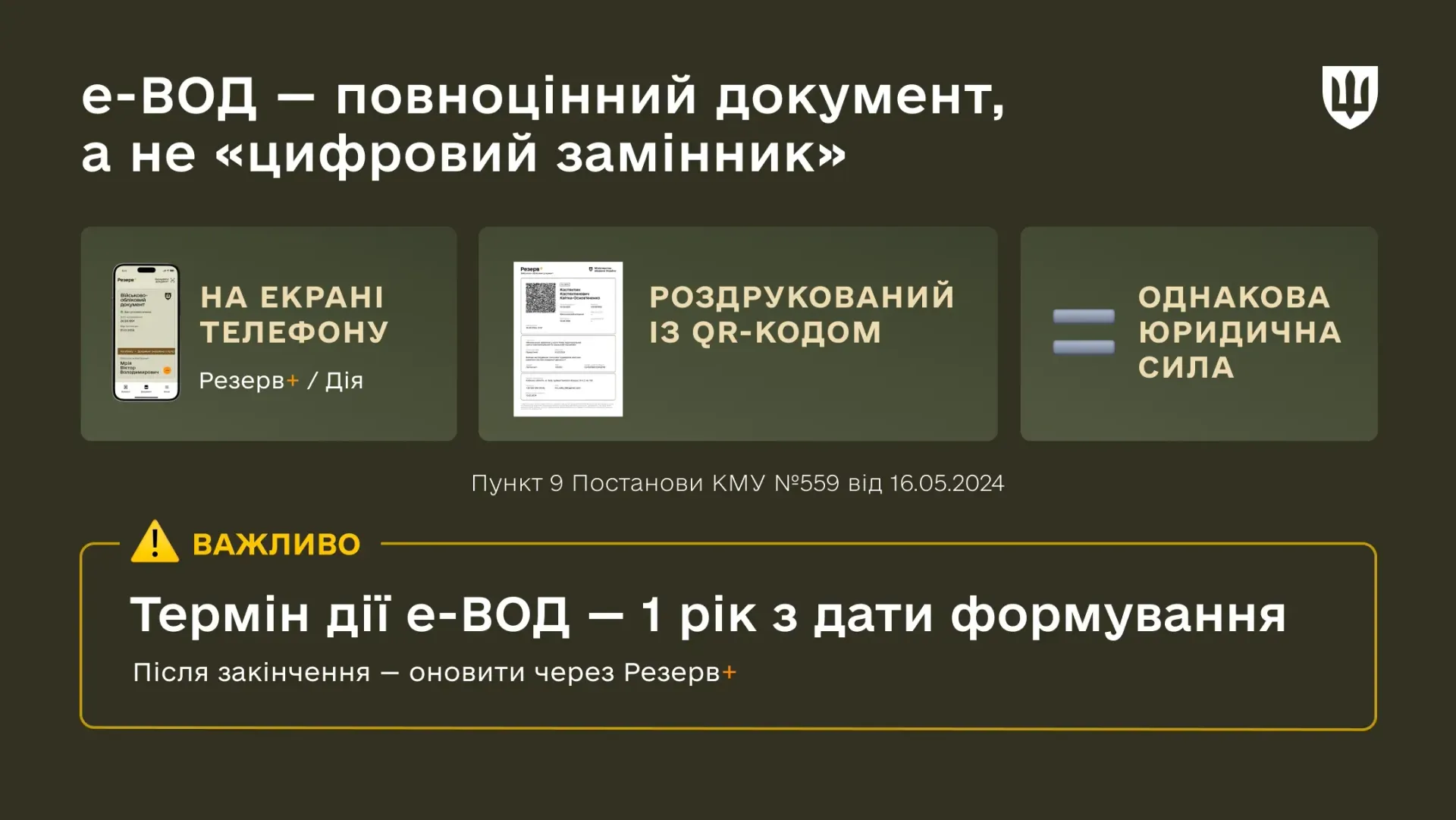 Важливо враховувати термін дії: е-ВОД дійсний протягом одного року з дати формування. Якщо рік минув — документ потрібно оновити через "Резерв+".