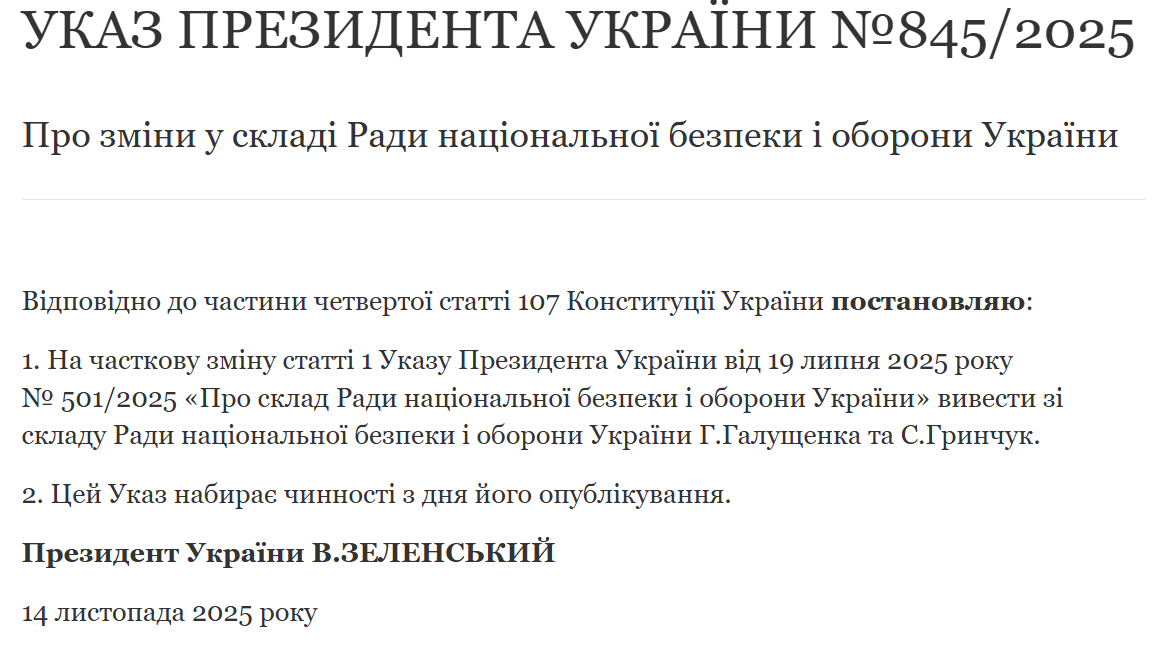 Так, у документі зазначено, що зі складу Ради національної безпеки і оборони України виведено Германа Галущенка та Світлану Гринчук. Цей указ набирає чинності з дня його опублікування, тобто з 14 листопада.
