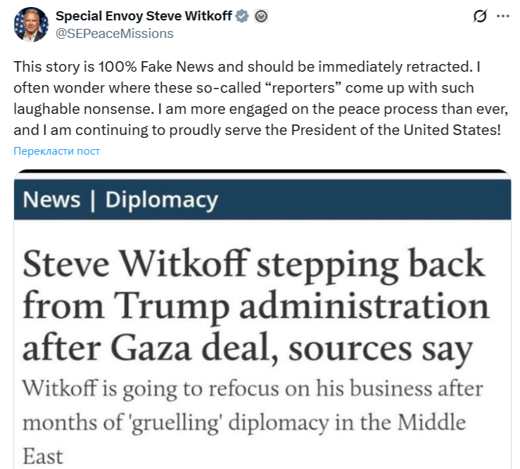 Деякі американські медіа повідомили про начебто плани Стіва Віткоффа піти у відставку з посади спецпредставника президента Сполучених Штатів Америки з питань Близького Сходу. Однак сам він назвав їх фейком.