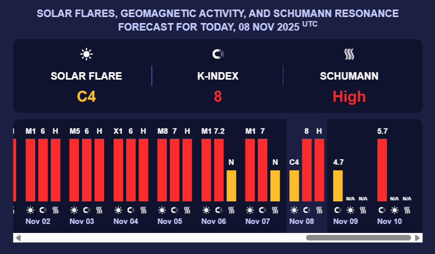 Зокрема, пік активності припав на суботу, 8 листопада, де індекс геомагнітної активності сягнув позначки 8 (червоний рівень небезпеки), що свідчить про дуже потужний вплив на магнітосферу Землі.