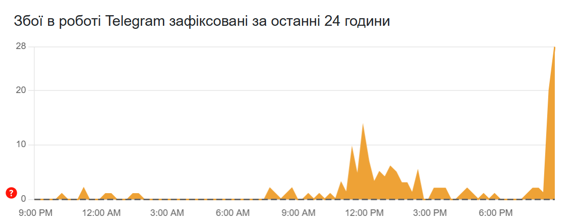 Про це свідчать дані порталу Downdetector. Зазначається, що з 20:11 було зафіксовано збій у роботі Telegram.