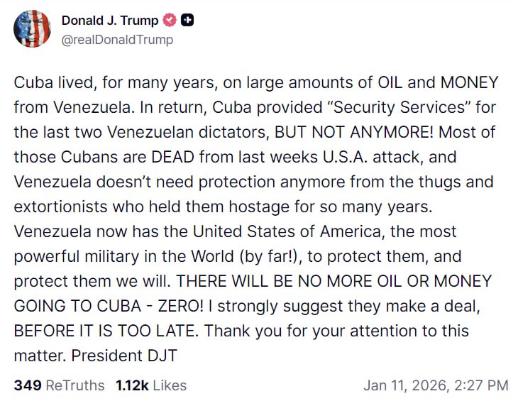"Куба більше не отримуватиме нафту та гроші з Венесуели. Венесуела більше не потребує захисту від бандитів та вимагачів, які роками тримали її в заручниках", — наголосив президент США.