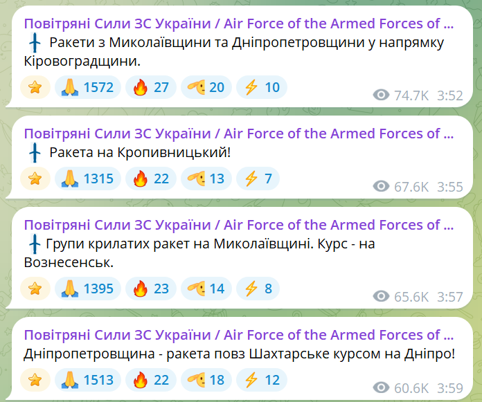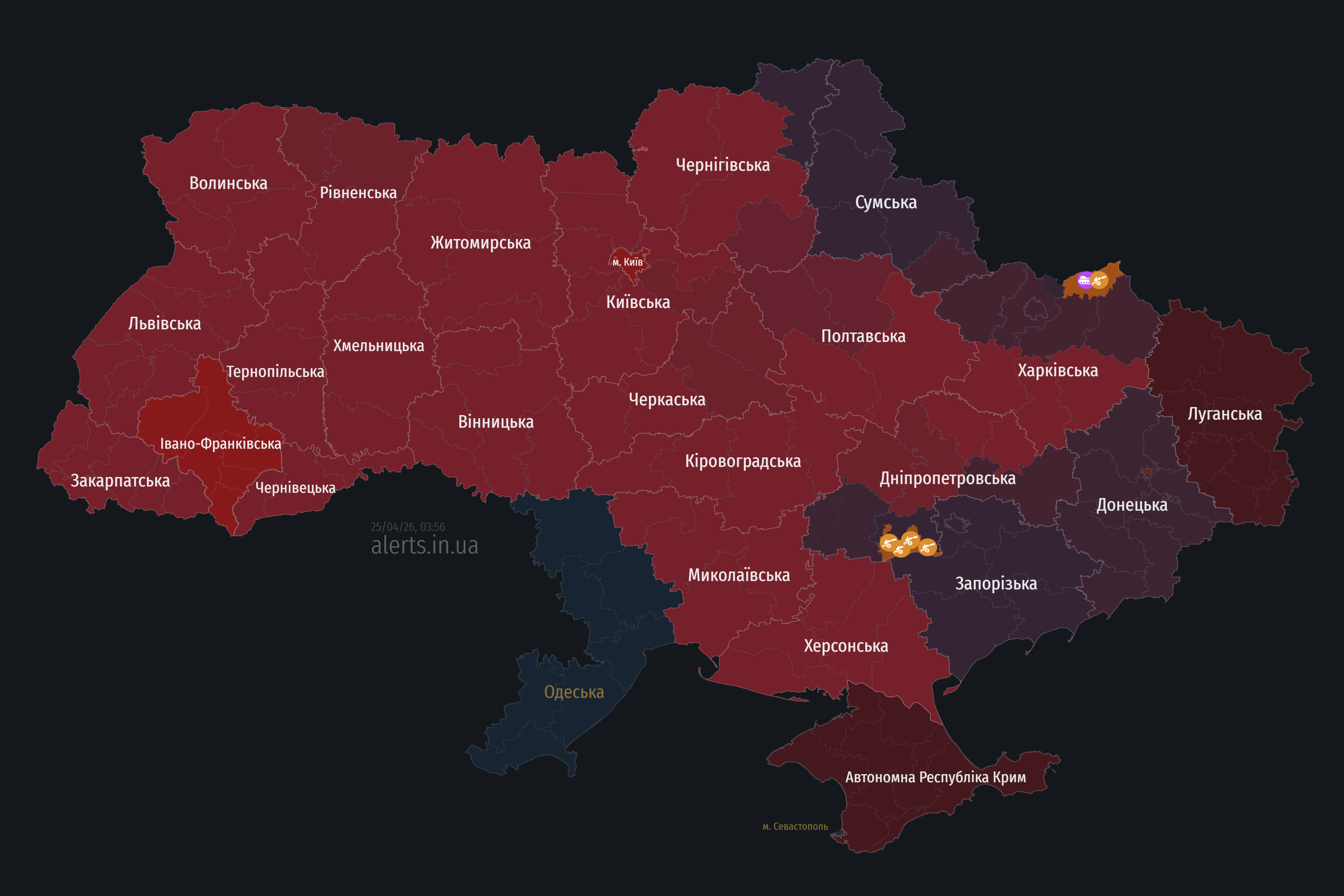 У ніч на суботу, 25 квітня, в усіх областях оголошено повітряну тривогу. Небезпека пов'язана із атакою ворожих ракет, які увійшли в повітряний простір країни з Півдня.